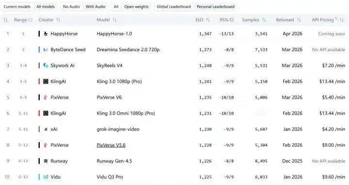 信息来源:新浪财经|2026年4月10日 快乐马登顶AI视频榜首 阿里颠覆AI行业 音视频一体模型 张迪新作