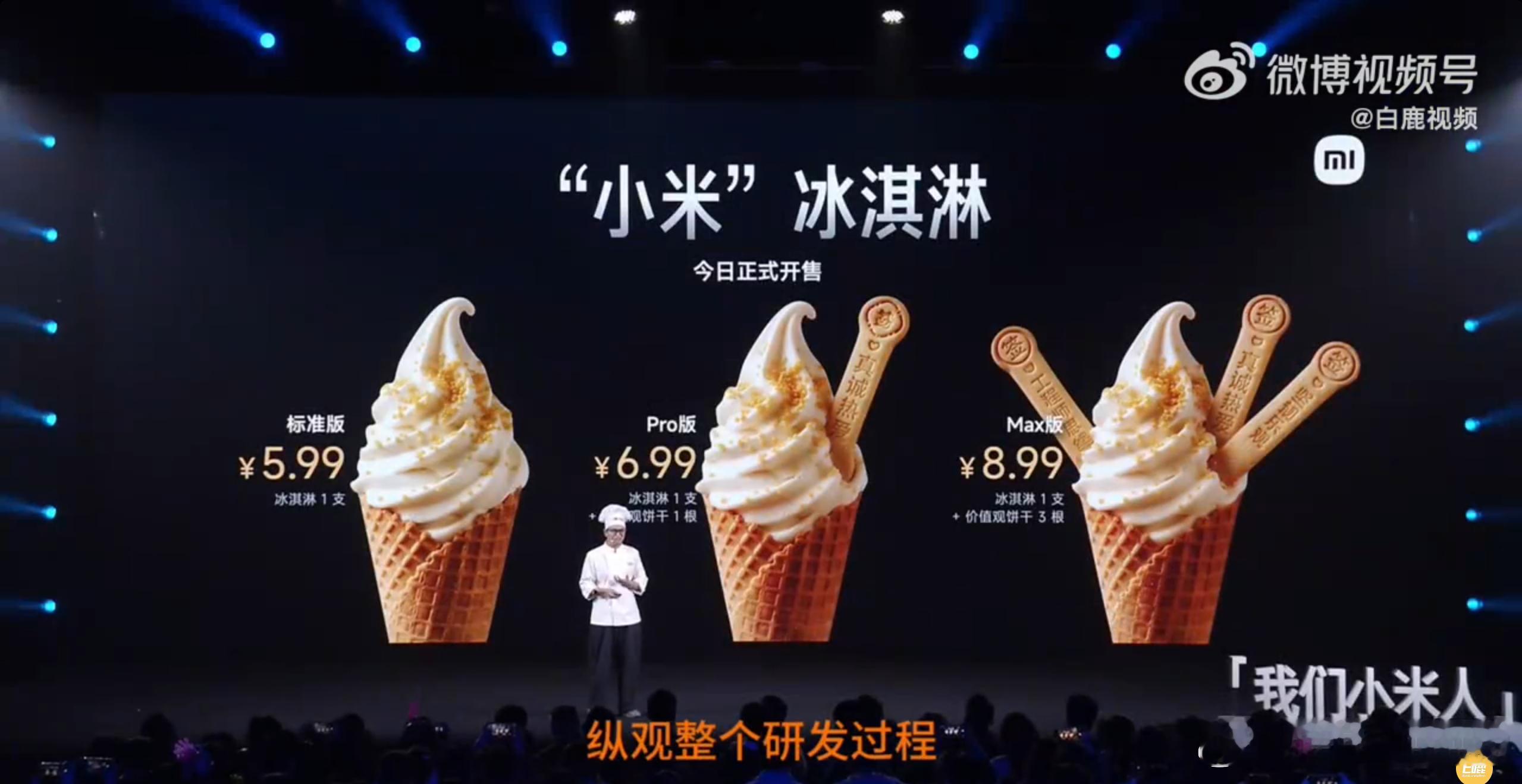 不得不说小米员工的发布会就是带有强烈的小米风格,大厨详细讲了冰淇淋研发过程中遇到的各种问题和解决方式,纯纯工程师思维,最后震撼退出了价格最低5.99起的小米冰淇淋,还整了Pro和Max版。