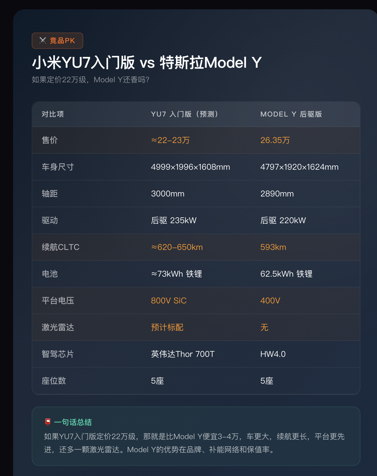 我猜价格。73度电池比96.3度电池成本低不少,再加上减重带来的其他成本优化,这个入门版定价应该在22-23万这个区间。如果雷军狠一点,21.99万起也不是不可能。