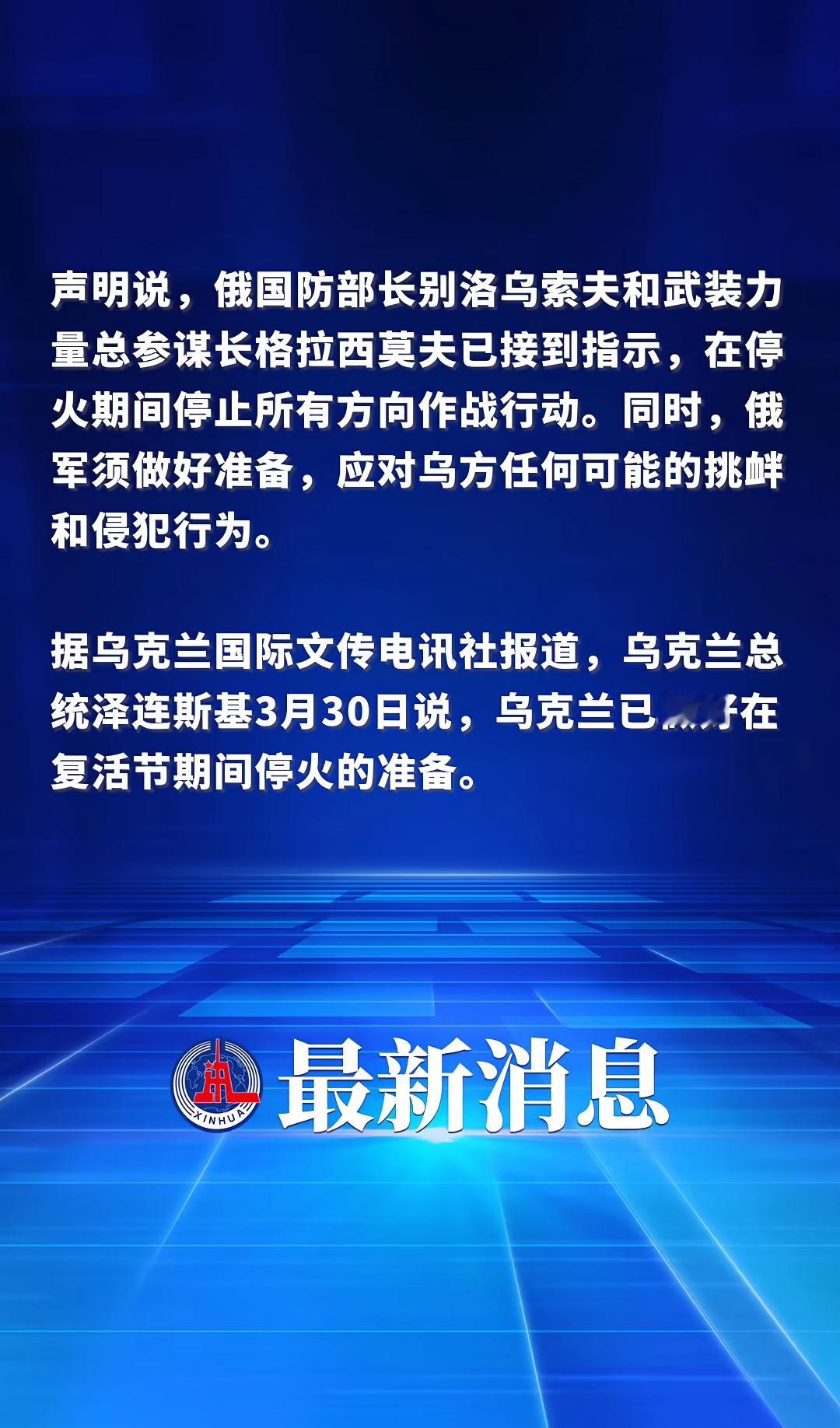 普京宣布停火32小时停火时间从莫斯科时间4月11日16时(北京时间21时)起,持续至4月12日午夜(北京时间4月13日5时)。