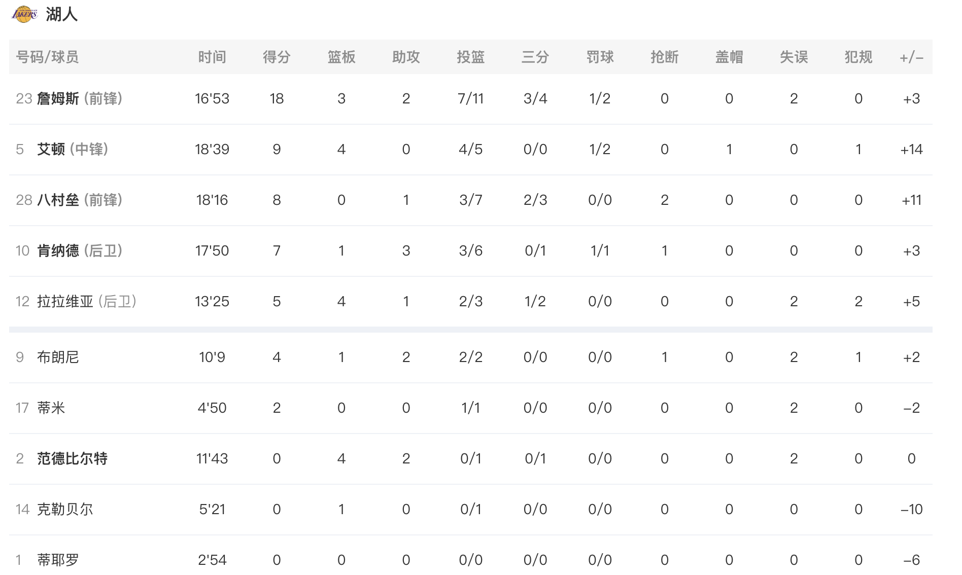 詹姆斯18分3篮板3助攻,布朗尼4分1篮板2助攻,八村8分1助攻2抢断,艾顿9分4篮板,拉拉维亚5分4篮板,肯纳德7分3助攻,范德彪4篮板2助攻,蒂米2分。