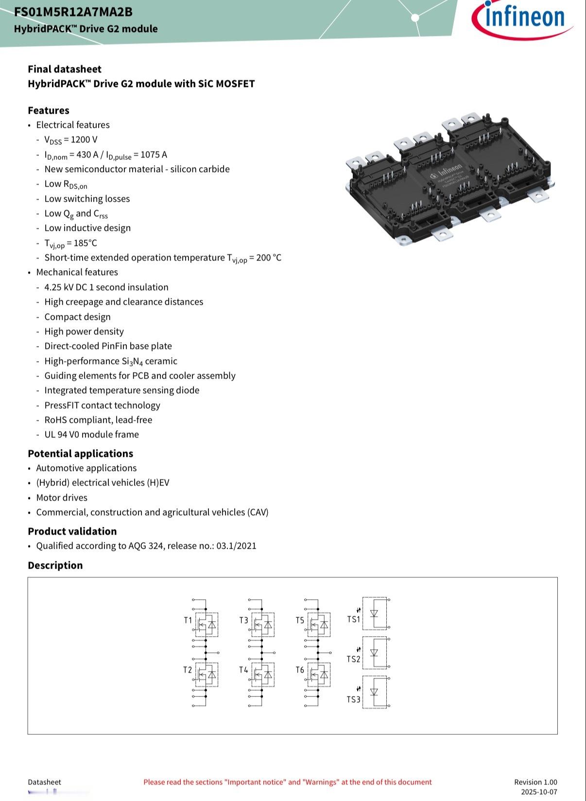 小米新SU7功率芯片采用的是英飞凌1200V耐压碳化硅,图1图2是其规格书节选。