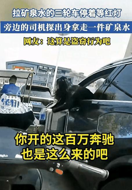 “真是缺德!”在等红绿灯的路口,停了一辆拉着矿泉水的三轮车,而三轮车旁边停了一辆奔驰,让人没想到的是,奔驰里的女司机竟然从车窗处探出身体,伸长手悄咪咪的把三轮车里的一箱矿泉水抱到了车上,三轮车上的师傅毫无所觉,而这一幕恰好被后面骑着电动车的小伙拍摄了下来。