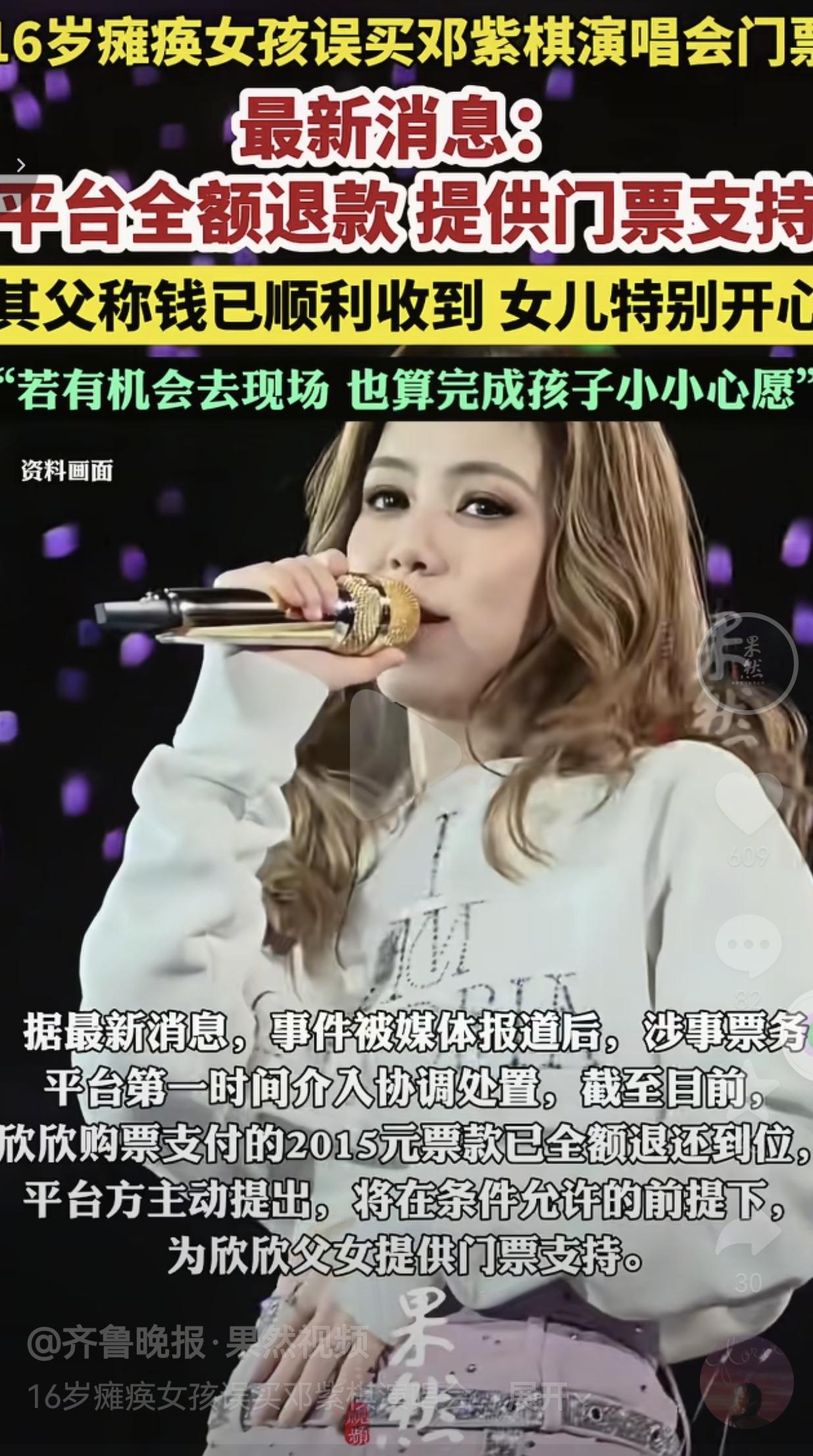 涉事平台高度重视,连夜介入、特事特办 :最终,2015元全额退还。并且还承诺:未来邓紫棋内地开唱,免费提供门票,帮欣欣圆梦 。