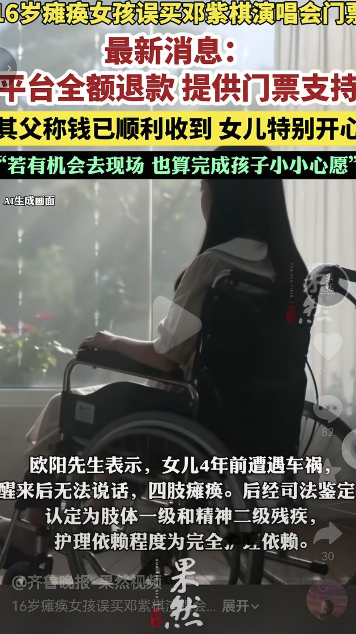 暖心反转!一个重度瘫痪、认知障碍的16岁女孩,误触手机买了2000多元演唱会门票,全家急得崩溃;平台一开始坚持“售出不退”,最终在舆论关注下全额退款,还承诺帮孩子圆追星梦。网友:这波反转,太暖了!