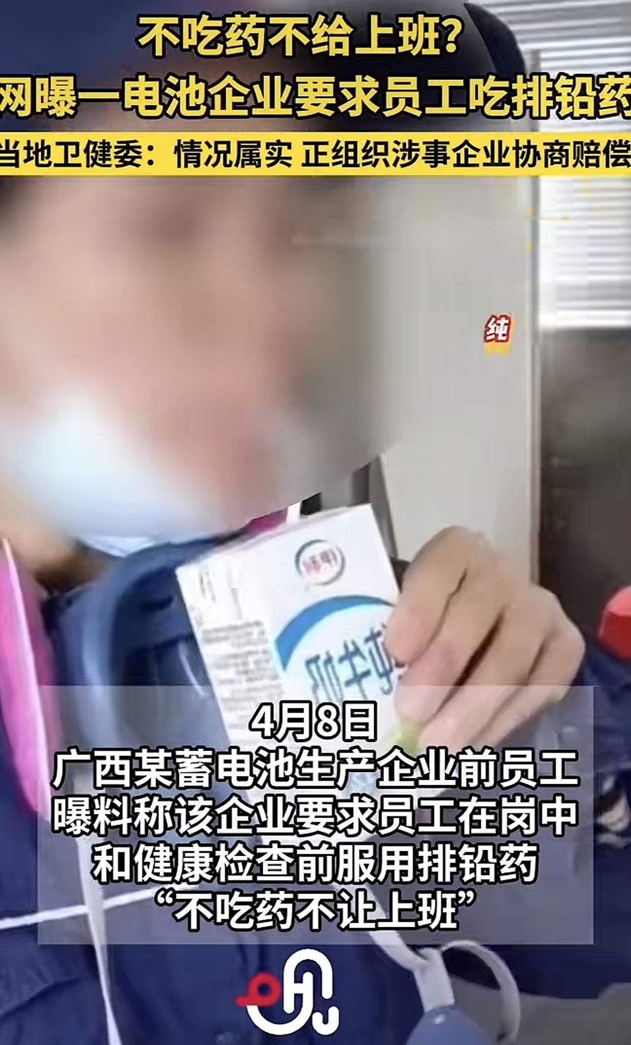 不吃药,不让上班的电池厂企业被曝光了,根据评论区网友描述,这是一家超威的电池厂。根据媒体报道说是企业为了让员工体检的时候,体内的铅不会被检测出超标,于是逼着员工们每天上班的时候吃排铅药,不吃的话就不让上班。但这个药是处方药,副作用是很大的,所以已经有员工出现了身体不适。