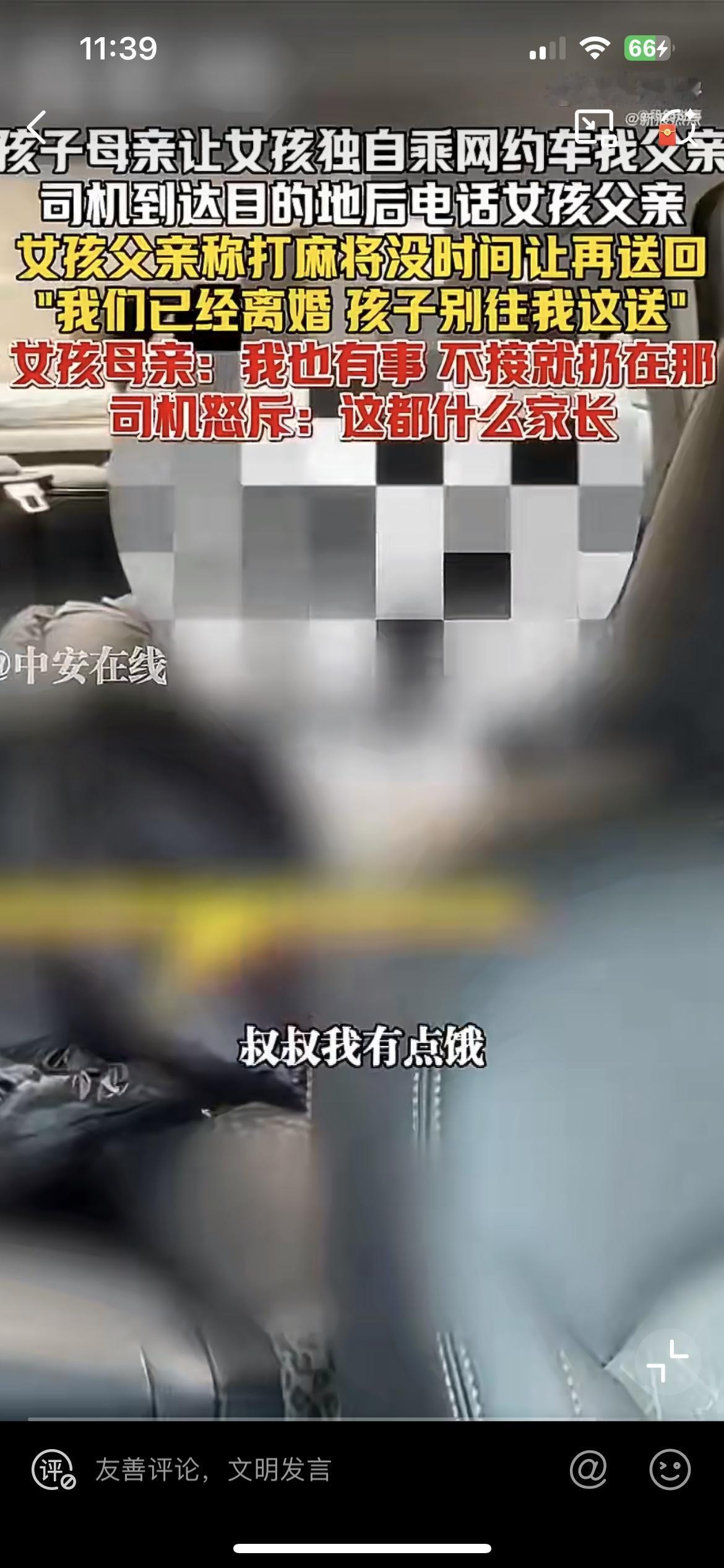 沈阳网约车司机遇到的奇葩父母,把孩子当皮球踢来踢去都不要。妈妈给孩子打了个网约车,送孩子去爸爸家,到了目的地让司机打电话联系孩子爸爸,叫爸爸来接。结果爸爸回复他在打麻将,没空。那孩子想送哪就送哪,和他没关系。又联系孩子的妈妈,妈妈说孩子想送哪就送哪,他不要就放路边。整的司机好无语,这是什么爹妈?连自己的亲生孩子都可以抛弃。眼见爹妈都不要,司机也没法把孩子放在路边太危险了,就问孩子饿不饿,带他去吃碗面。司机是个好心人,遇到这种情况最好还是报警吧,让帽子叔叔来处理。