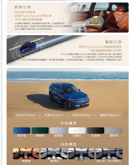 星甲笼车身+1500MPa 硼钢,88%得房率,后备厢最大1990L,Flyme Auto 2座舱+龍鹰一号芯片,语音交互流畅,H3智驾支持高速NOA+全场景自动泊车。