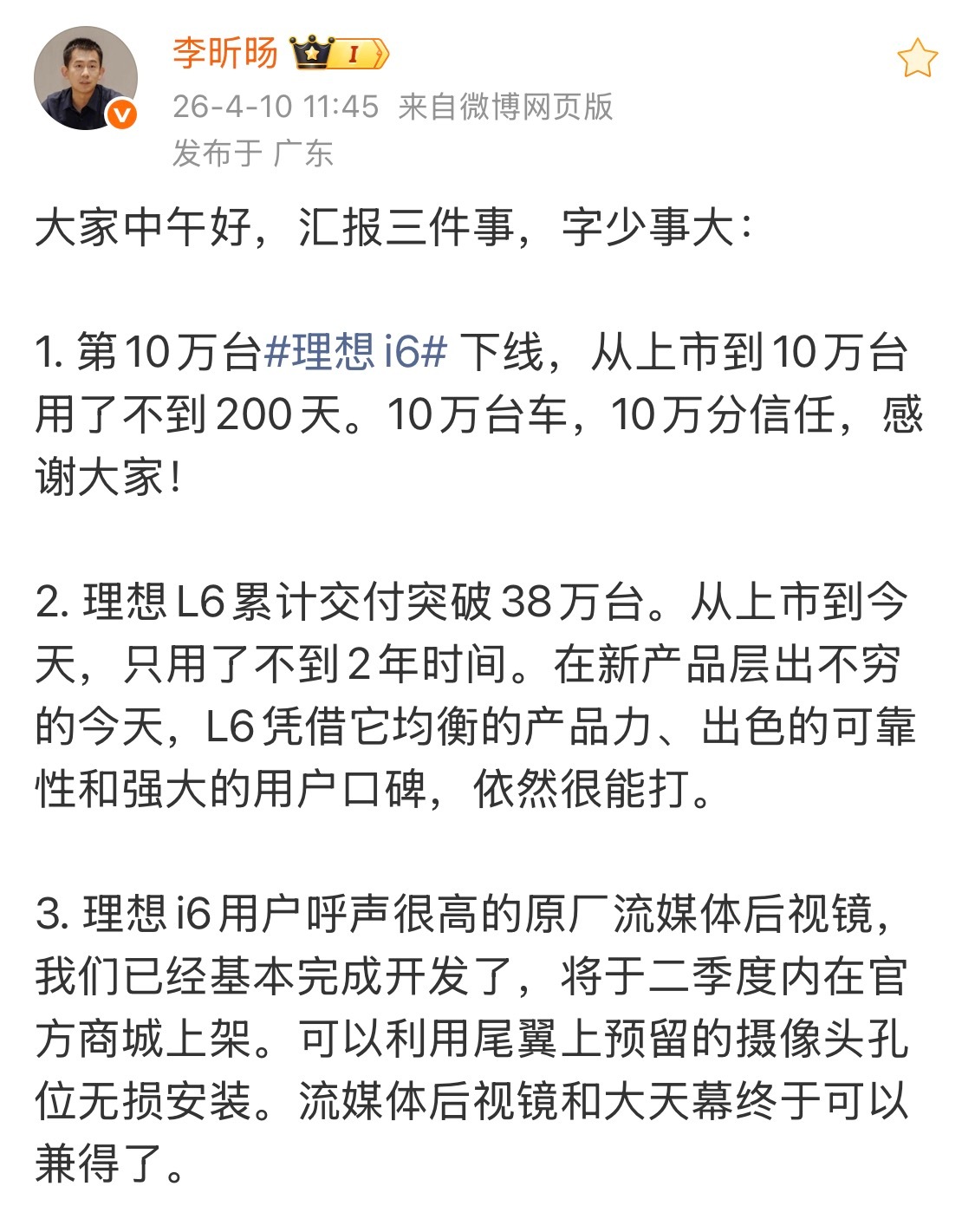 最新消息,当时没选流媒体+二排电视的i6二季度可以单独安装流媒体后视镜啦理想i6第10万辆量产车正式下线理想i6