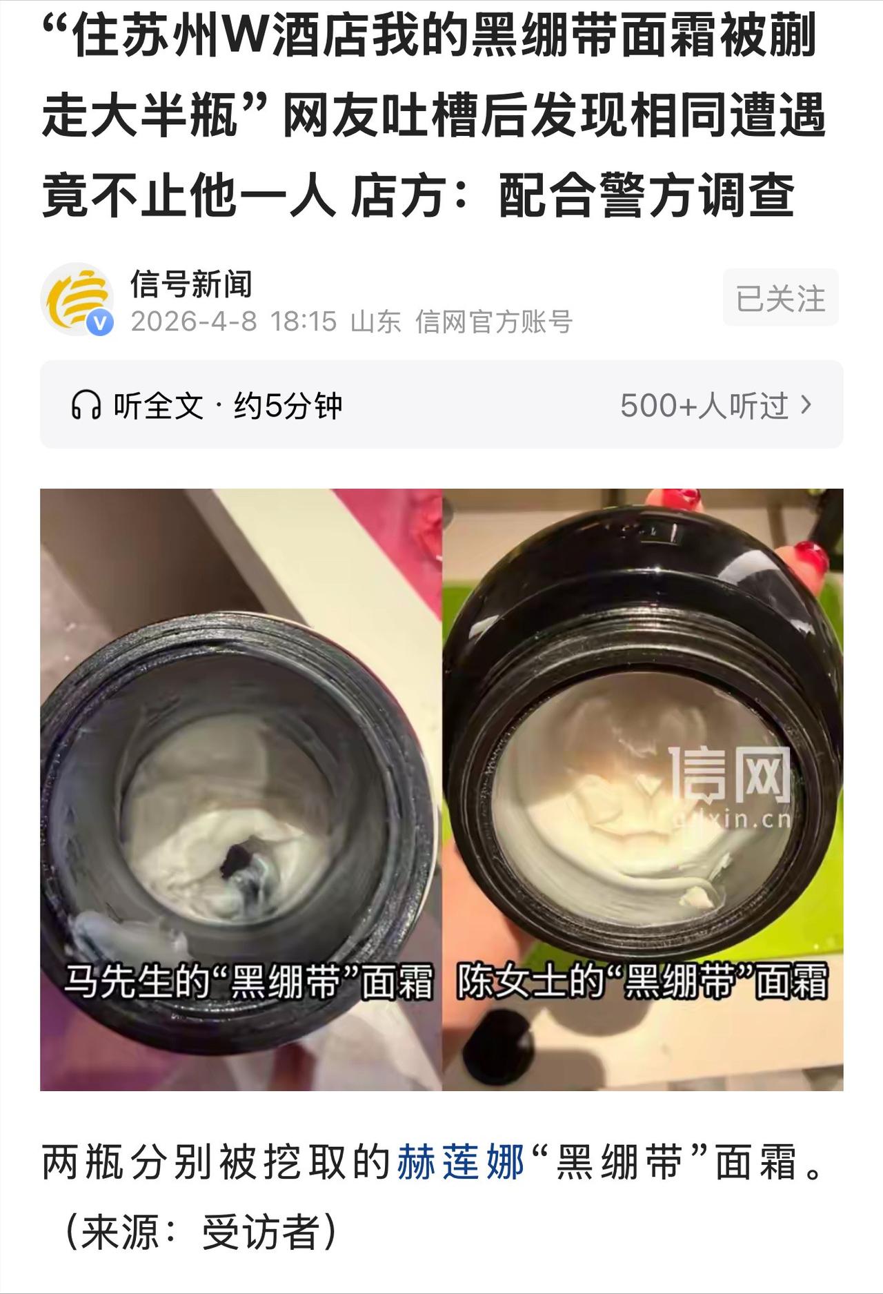 信息来源:信网 2026-04-0818:15 "住苏州W酒店我的黑绷带面霜被蒯走大半瓶"