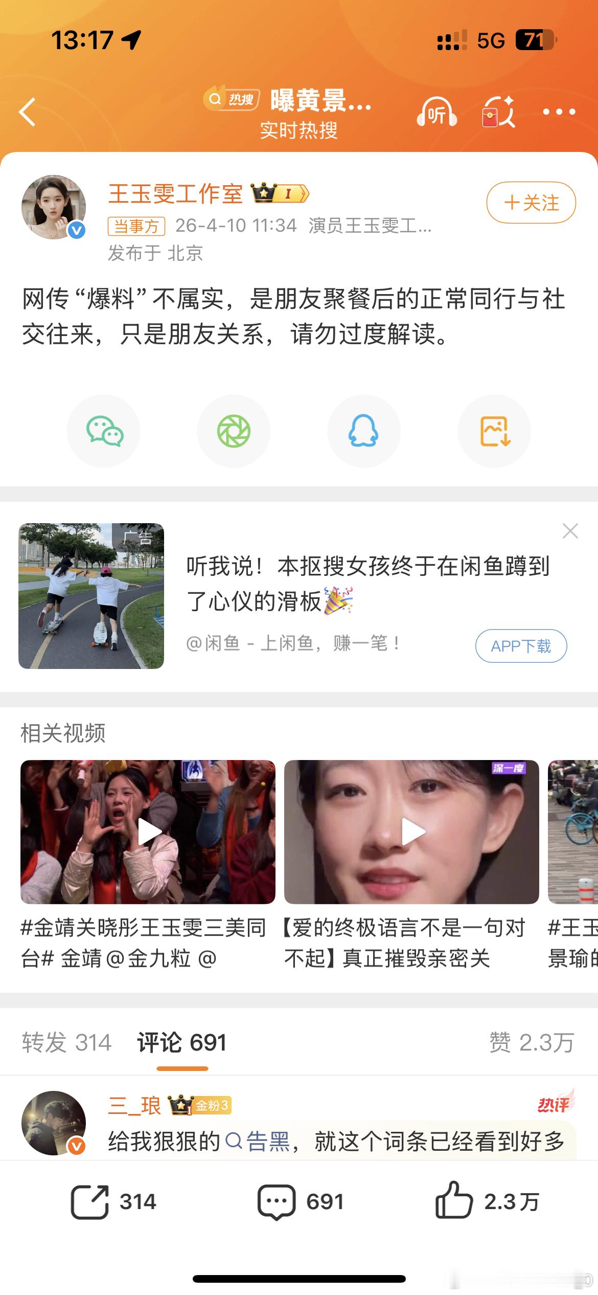 曝黄景瑜王玉雯恋情两个工作室都回应了,别瞎传,就朋友正常吃个饭