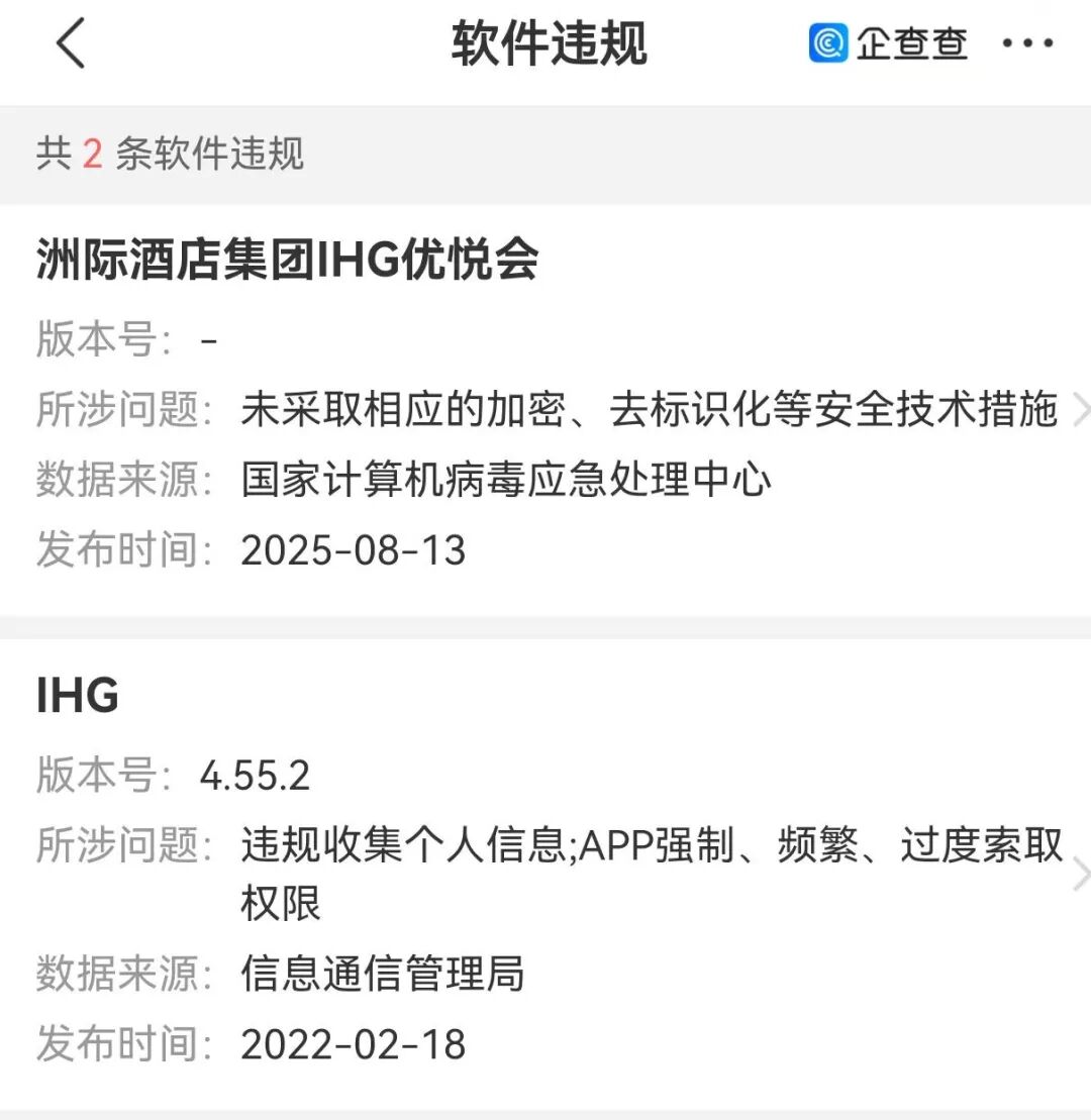 值得一提的是,该公司IHG、洲际酒店集团IHG优悦会曾因软件违规被通报,所涉问题包括违规收集个人信息;APP强制、频繁、过度索取权限,以及未采取相应的加密、去标识化等安全技术措施。