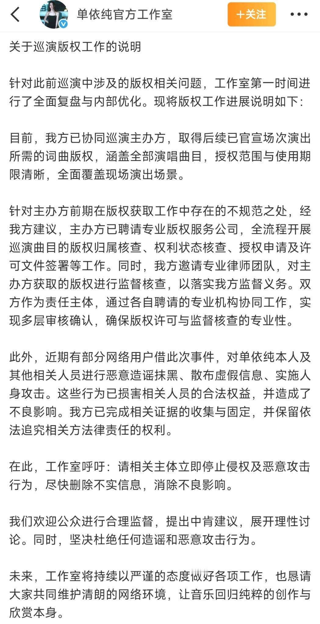 单依纯工作室巡演版权说明版权是音乐创作的生命线,商业演出“先唱后补票”的行为,本质是对原创的漠视。此次事件为演艺行业敲响警钟:无论是艺人、主办方,都必须严守著作权法红线,以专业、规范的流程保障创作者权益,共同维护健康的行业生态。