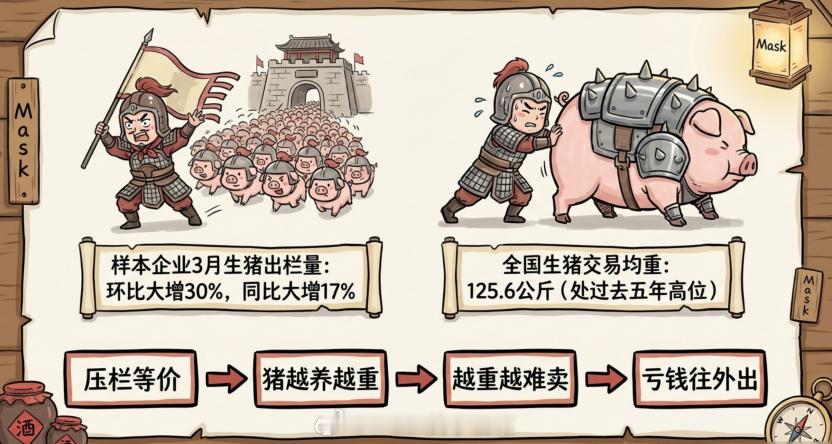 为什么会这样?因为猪企养的猪实在是太多了。3月样本企业生猪出栏量环比大增30%,同比增长17%,而全国生猪交易均重达到125.6公斤,处在过去五年的高位。甚至这次不仅猪多,而且还是重猪多。啥是重猪?字面意思,很重的猪……所以市场上的猪不只是数量多,单头还更重,肉也更多。