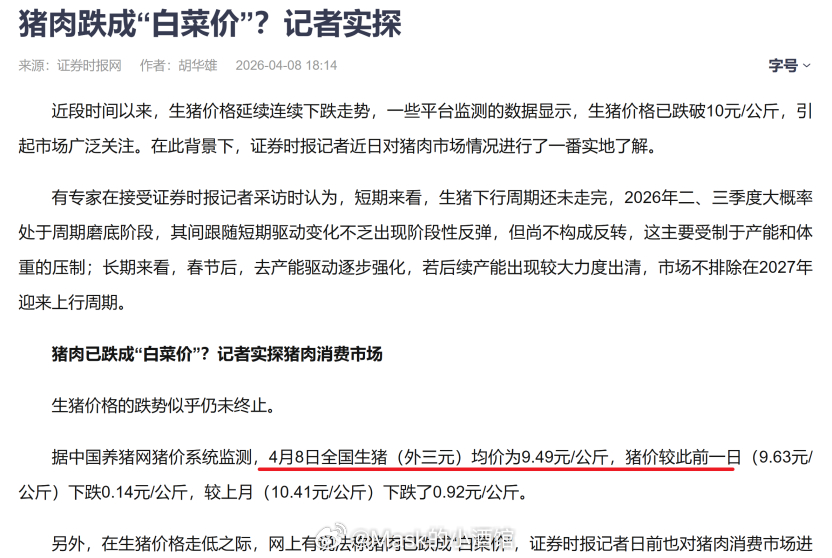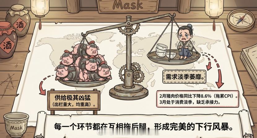 贼扎心,因为它说明养殖户不是不想赚钱,而是对未来已经没那么愿意下注了,绝望了啊!连仔猪都卖不出好价,意味着母猪的价值也开始缩水,行业预期明显变冷!惨到啥程度?目前行业普遍处在深亏区间,自繁自养头均亏损大概250到300元,有的测算口径甚至更深。比如有的机构就显示,3月初自繁自养头均亏损约176.34元,外购仔猪养殖也亏了87.42元;而若按更完整成本口径去算,行业单头亏损甚至可达到几百元。也就是说,这不是赚多赚少的问题,而是扎扎实实地卖一头亏一头!再看消费端,也帮不上太多忙。国家统计局数据显示,2026年2月猪肉价格同比下降8.6%,拖累了CPI;从3月中旬到3月下旬,生猪外三元价格从10.1元/公斤跌到9.5元/公斤,市场在消费淡季里缺少足够承接。供给很猛,需求又不旺,价格自然一路被压着走。所以,如果只看眼前,这轮猪周期确实很惨,几乎每个环节都在互相拖后腿。
