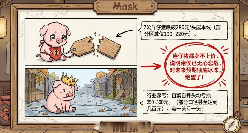 前面很多养殖场想压栏等价,结果越压越重,越重越难卖,最后只能一边亏钱一边往外出。这还没完。正常来说,肥猪亏钱,仔猪还能撑一撑;但这次很多时候连仔猪也开始亏。3到4月本来是传统补栏旺季,可现在7公斤仔猪价格却跌破了大约280元/头的成本线,部分区域甚至跌到190到220元/头。