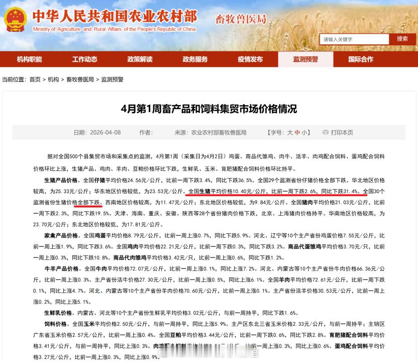 化工文章有点难产,过几天发,今天先写写养猪。养猪行业的大周期要来了。因为这轮猪周期,着实是不一般的惨……如果只是猪价跌一点,行业其实早就见怪不怪了。可问题在于,这次几乎所有指标都说:这轮下行,打得很深,打得很久……农业农村部4月第1周监测数据显示,全国生猪平均价格已经跌到10.40元/公斤,而且30个监测省份全部下跌。