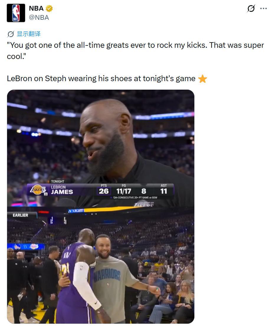 在谈到库里今天穿自己的球鞋时,詹姆斯表示:
