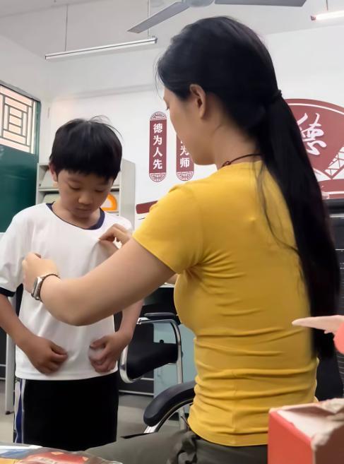 “来,宝贝,试试这件新衣服,看看合不合身”,刘老师笑着揉了揉孩子的头,温柔地帮他换上了崭新的白色短袖,孩子低着头,小手紧紧攥着衣角,眼神里有点局促,又藏着满满的感动,小声说了句“谢谢老师”,眼眶瞬间就红了。