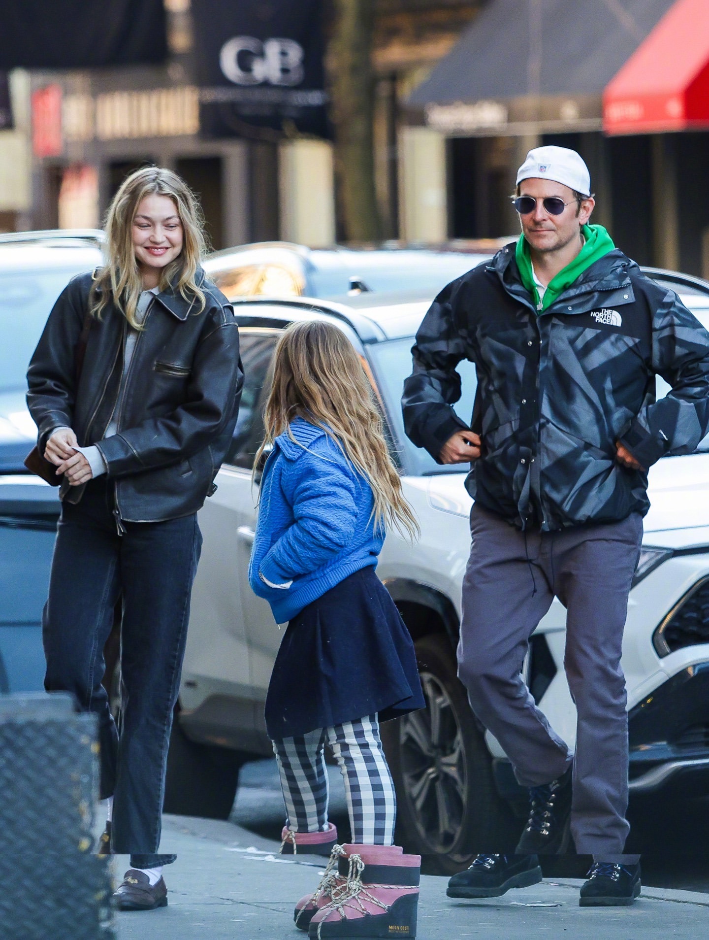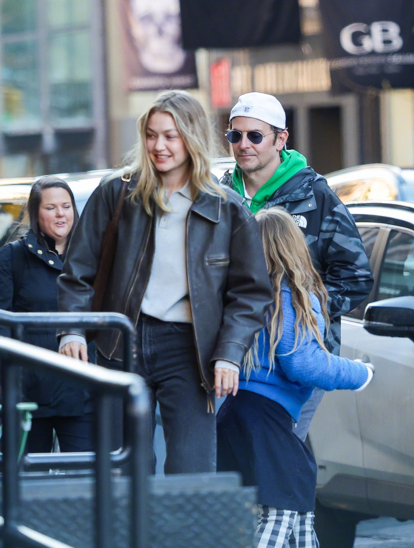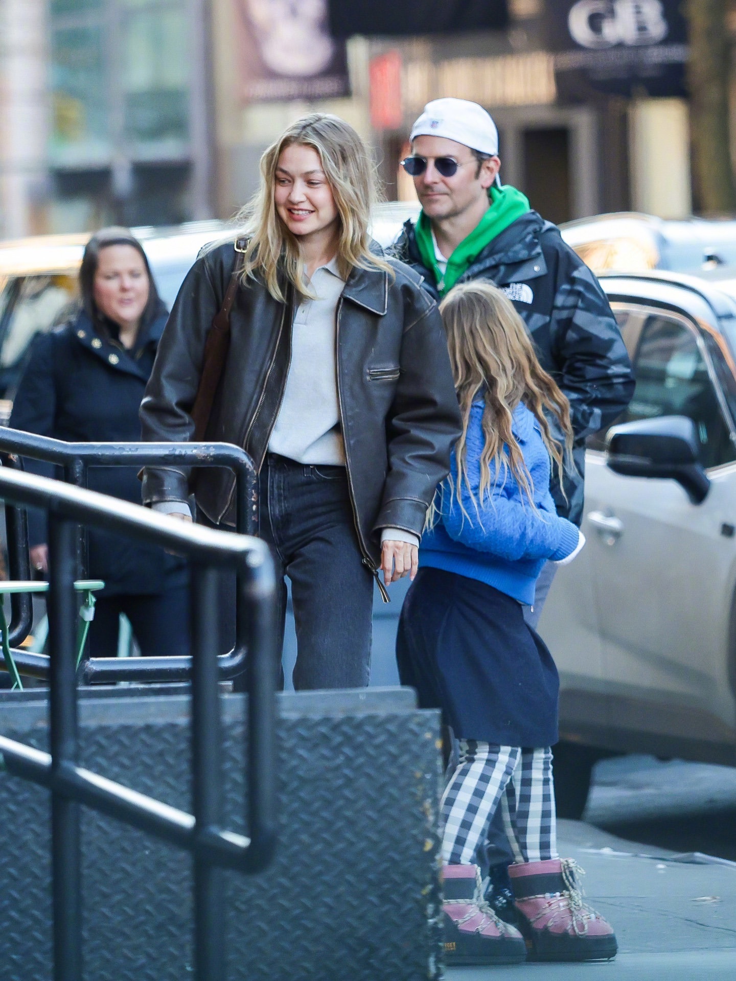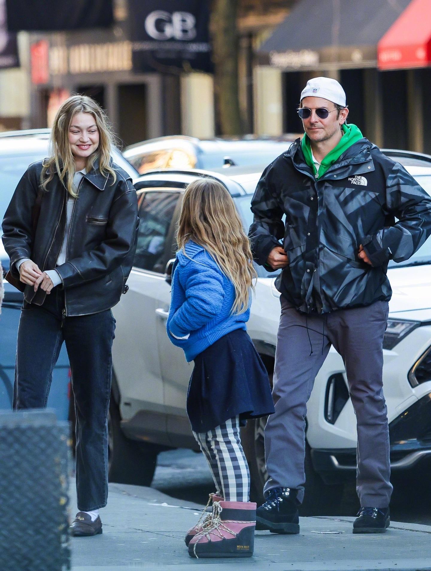 当地时间4月8日,Gigi Hadid 与男友库珀 Bradley Cooper 及他的女儿Lea De Seine 在纽约外出被拍。两位在一起已经两年半了,感觉很合拍!Gigi 身穿的是Miu Miu 皮衣,脚穿Miu Miu乐福鞋。米拉服饰解析