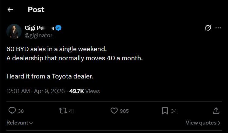 更有意思的是,这个消息不是来自比亚迪自己,而是从丰田汽车经销商那边传出来的。