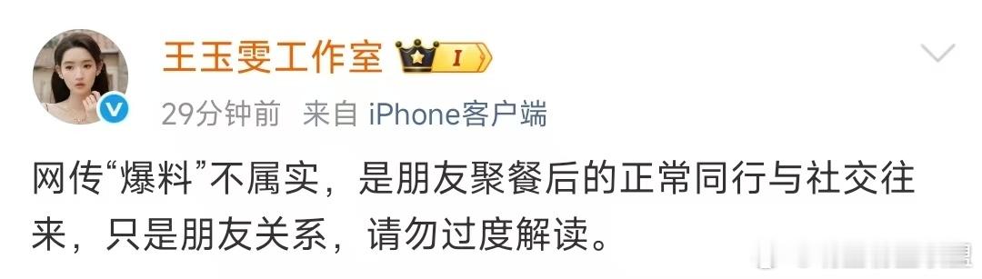王玉雯工作室否认恋情 工作室加鸡腿!火速回复,言简意赅解释清楚了,咱王姐一直都是大大方方的,普通朋友聚个餐罢了~王玉雯方否认和黄景瑜恋情