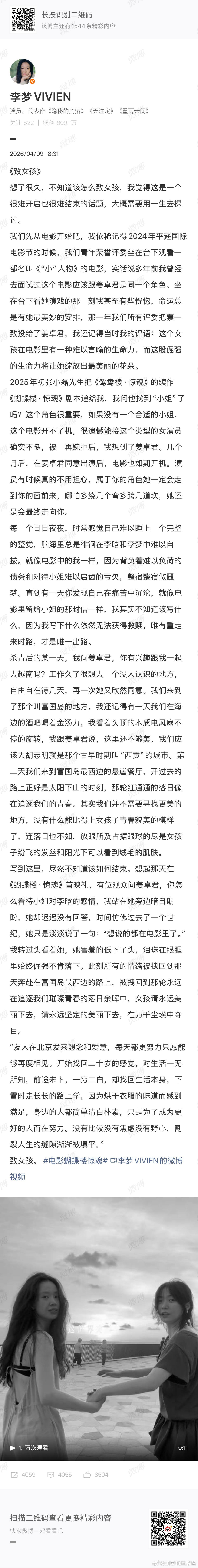 李梦致女孩长文 真的会被女演员之间的惺惺相惜感动到。发了长文《致女孩》,字里行间能够感受到女演员之间相互扶持和力量的传递。李梦用柔软的文字触达观众的灵魂,在电影《蝴蝶楼·惊魂》中尽然体现,两位女演员的表演十分动人,这不仅是现场的磨合就能有的结果,更是心底积累下来的信任而来的锦上添花。