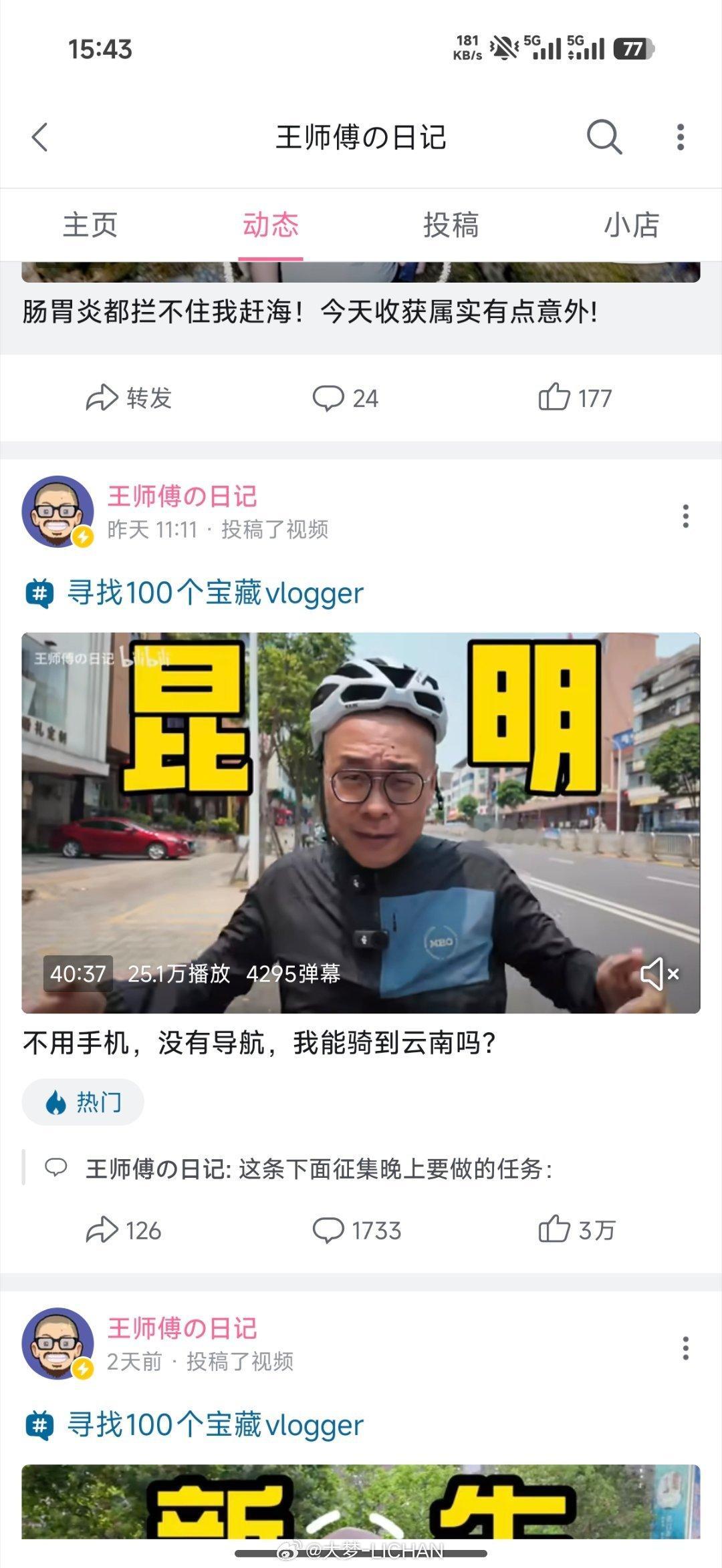 内容就是挑战不用手机从广东骑车到昆明,然后每天的经费就是点赞数除以10,光看数据他平时视频大概两三千,第一期发了之后有三万,就是翻了十倍,播放量也翻了好几倍。