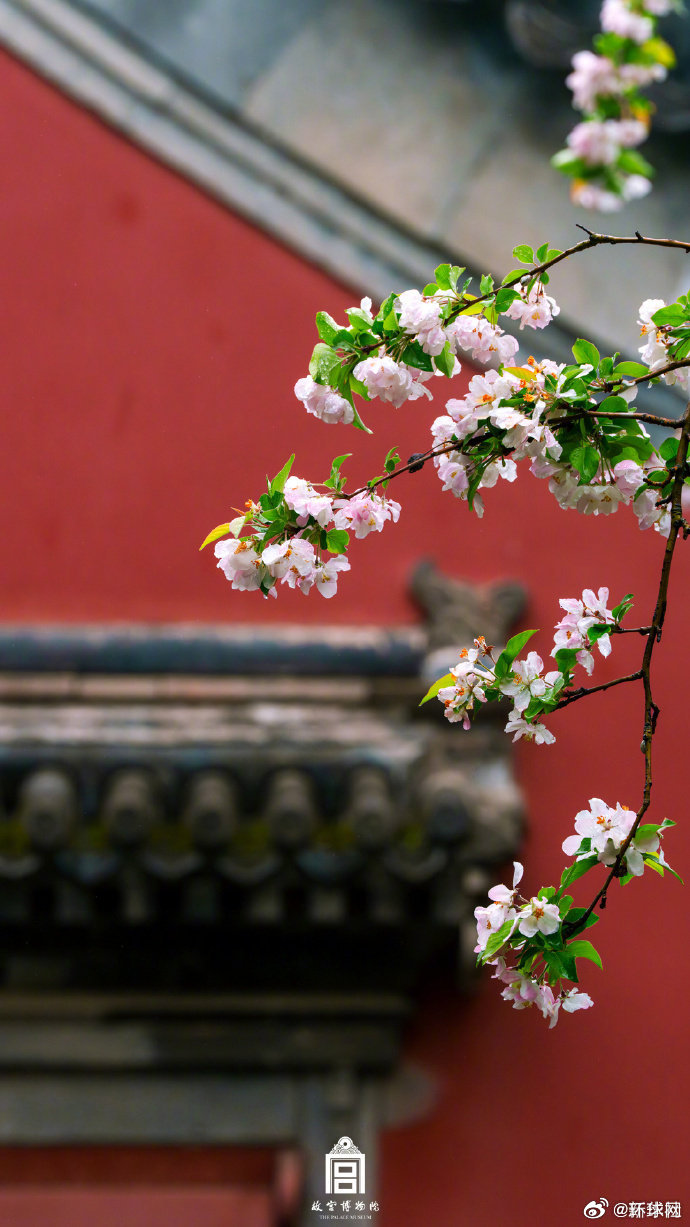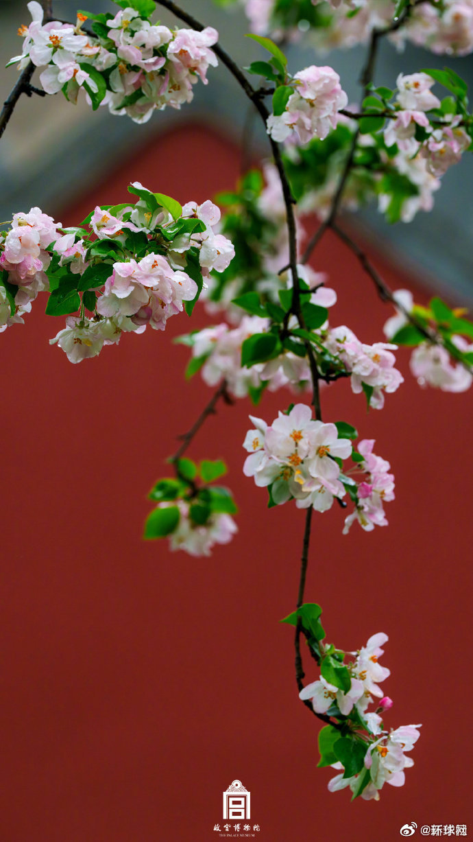 【#雨后故宫海棠醉了春光#】春雨过后,故宫的海棠更显清丽动人。花瓣沾着水珠,红墙