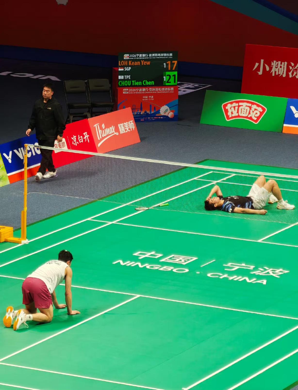 刚刚结束的男单1/4决赛中,周天成淘汰了骆建佑,晋级四强。苦战三局,最后俩人都打趴下了(P3)[捂脸]
