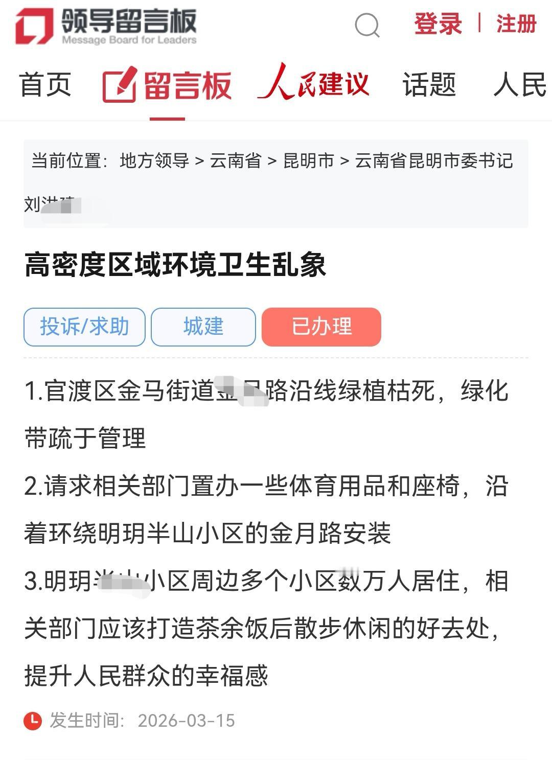 近日昆明网民通过人民网领导留言板给昆明市委书记的留言