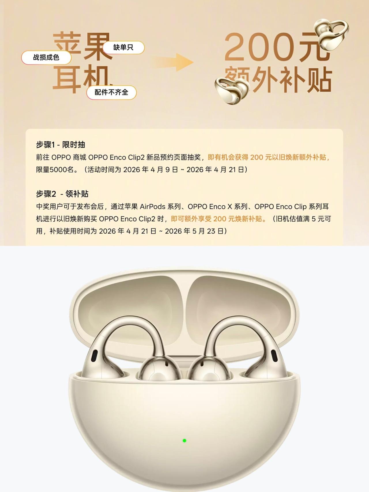 看了下,活动4.9开始,在OPPO商城的OPPO Enco Clip2预约界面抽奖