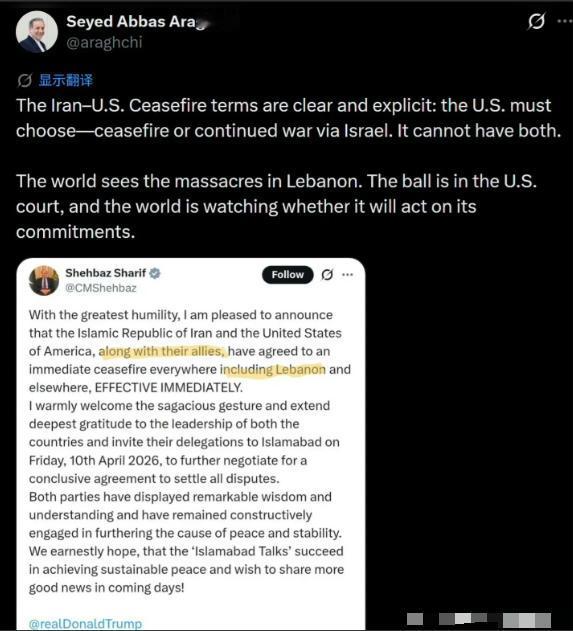 伊朗外长阿拉格齐4月8日晚直接出手,把谢里夫的官方停火声明原文贴到社交媒体上,关键那句话一个标点都没动:"包括黎巴嫩在内的所有地区立即停火,即日生效。"这是巴基斯坦总理以调停国身份发出的正式文件,不是口头客套,不是模糊表态,是经过各方反复确认后的书面承诺。谢里夫敢拿国家信用担保发出来,说明美方当时确实点过头。