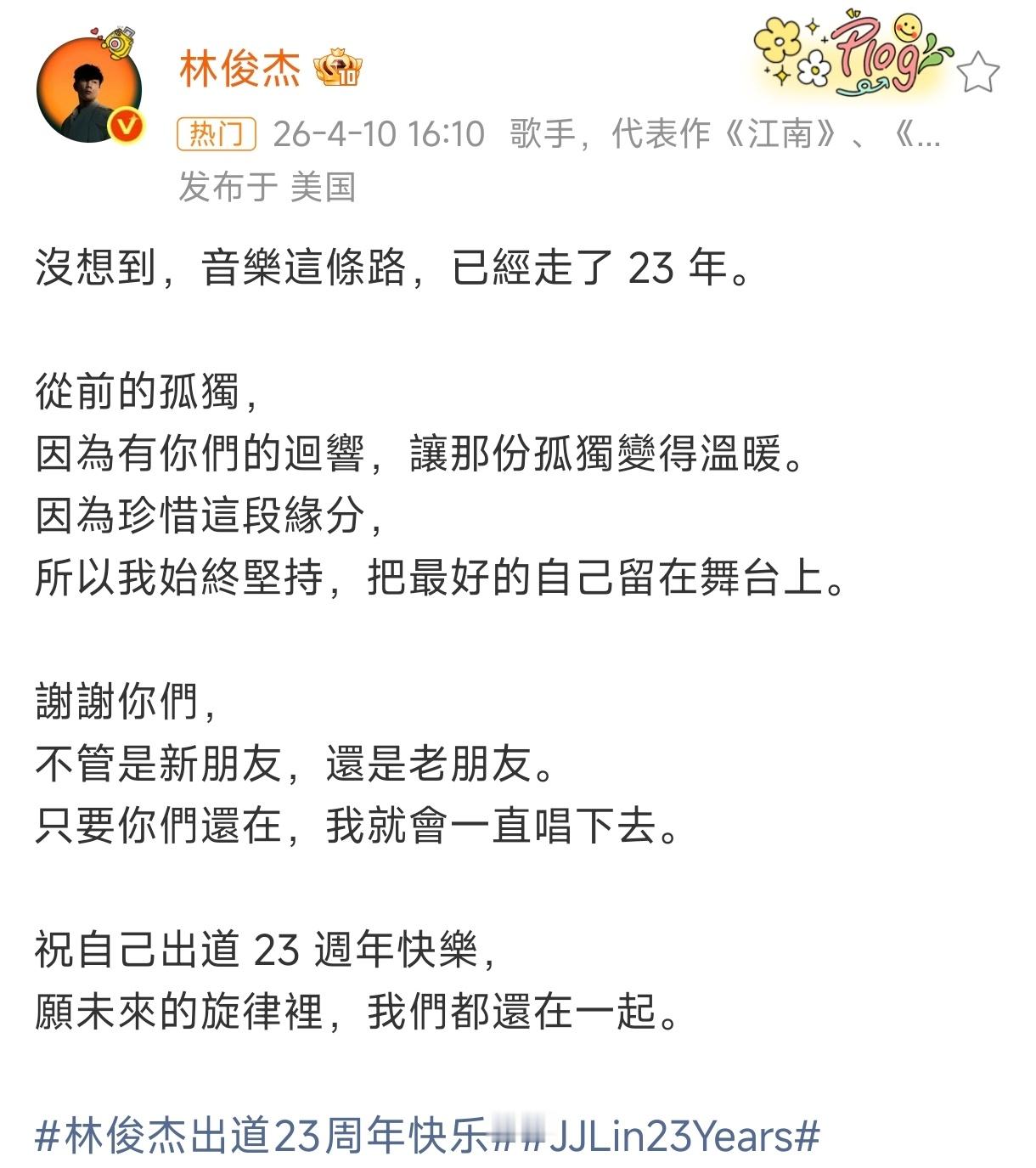 林俊杰发文庆祝出道23周年林俊杰出道23周年发文,祝自己出道23周年快乐,未来的路也一起走吧!林俊杰发文纪念出道23周年