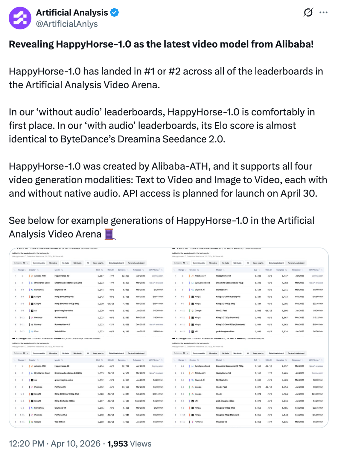 📮HappyHorse-1.0,4月7号悄悄上了 Artificial Analysis 的盲测榜,没开发布会没发博客,直接空降第一。全网都在猜是谁做的,张迪团队、腾讯、小米、DeepSeek,各种猜测满天飞。
