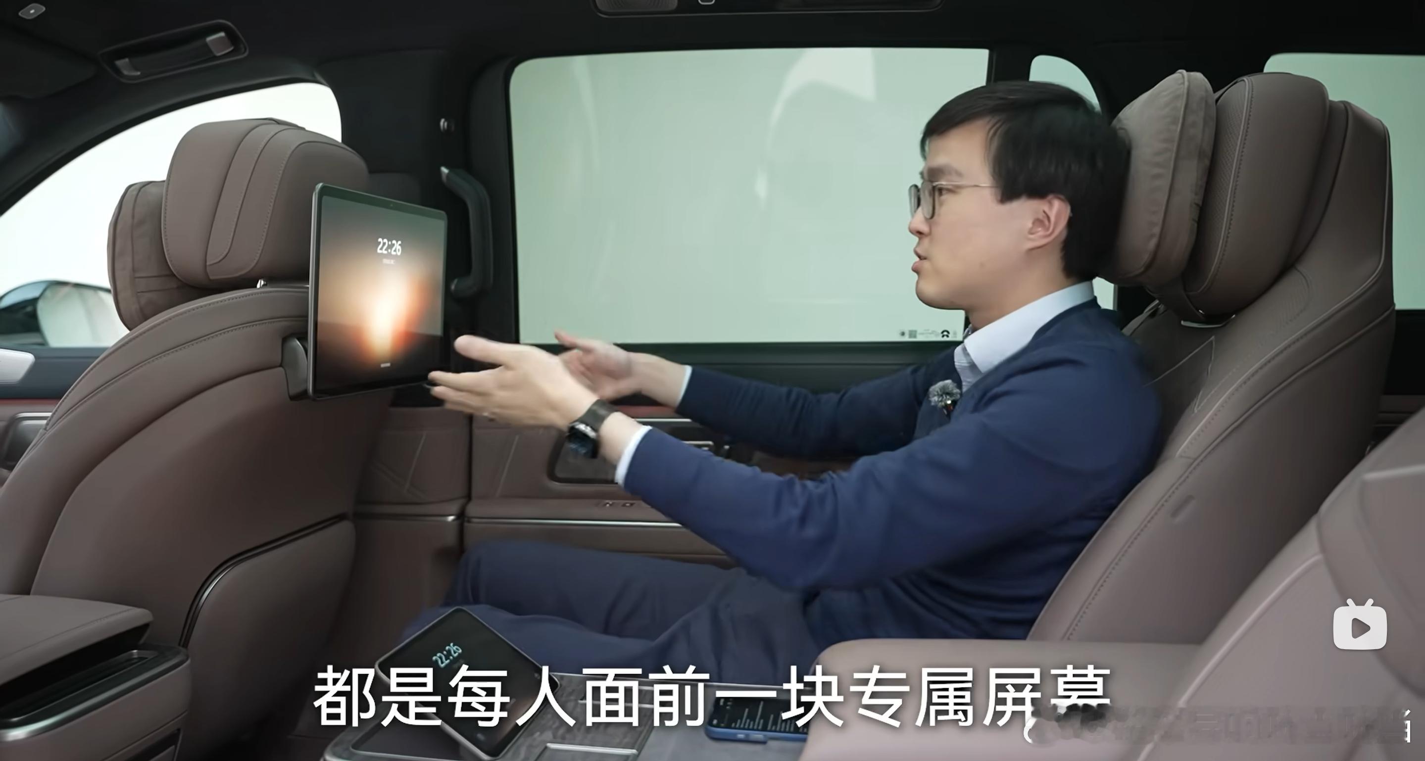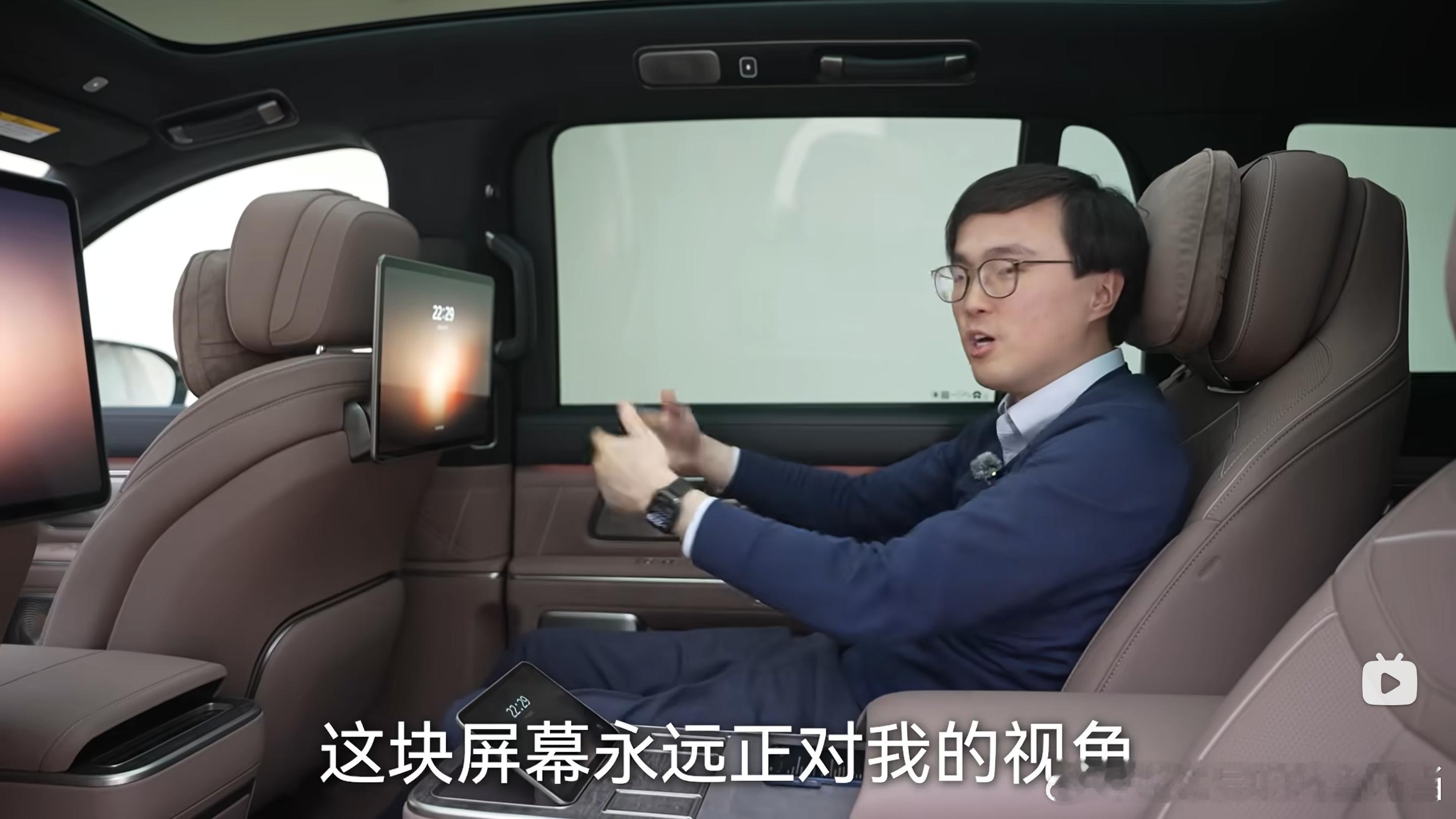 但商务车,四座状态,坐在上面的俩人上是需要高频互动说话,分享的,如果他俩居然各看各的电视了,说明这场商务接待就纯纯失败了。