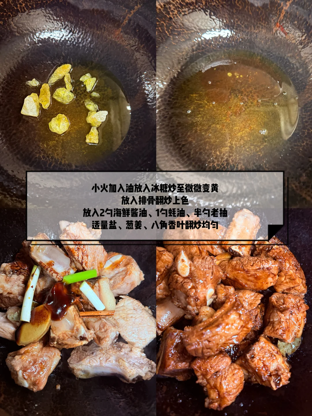 炒糖色的时候一定要小火不然容易糊,糊了就会有苦的口感哦!放入排骨的时候也要小心,容易溅油,放入排骨翻炒均匀后,火再调大一点哦![飞吻R][飞吻R]