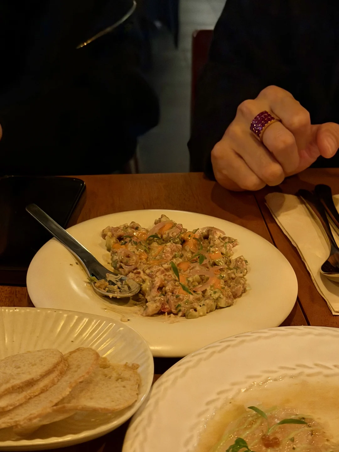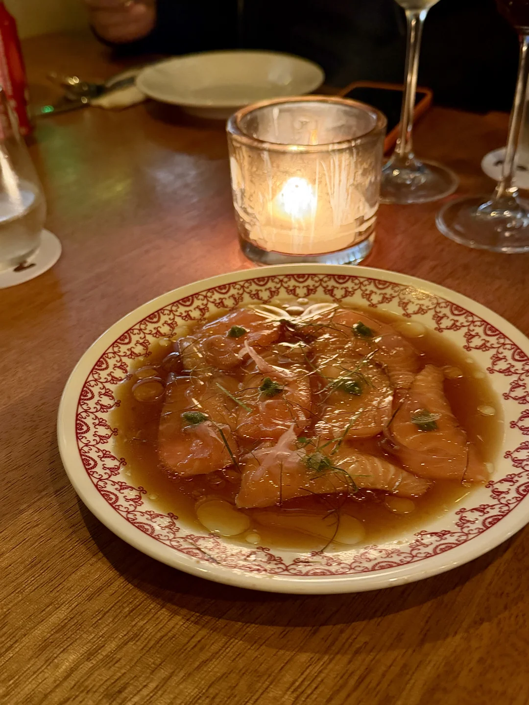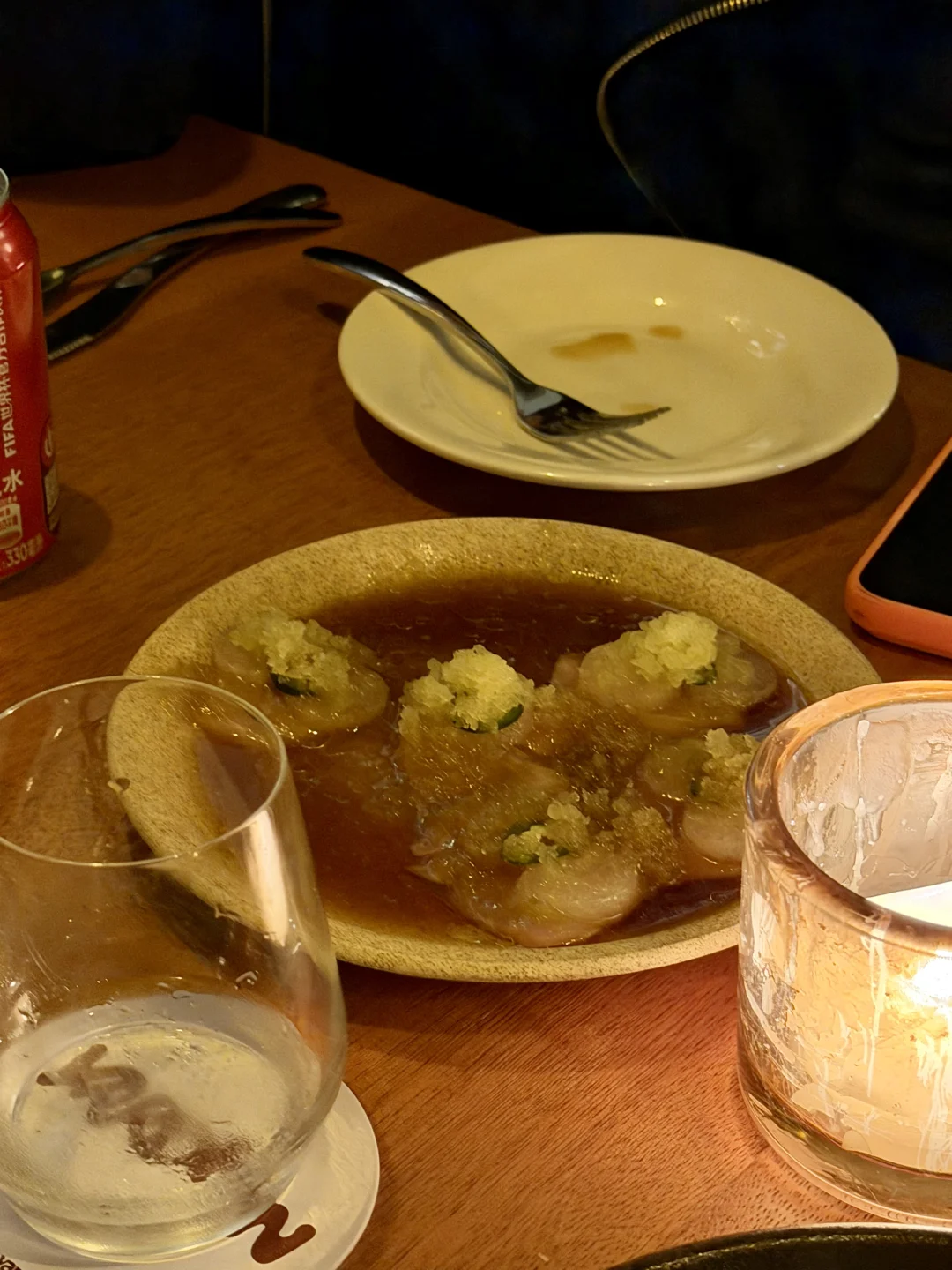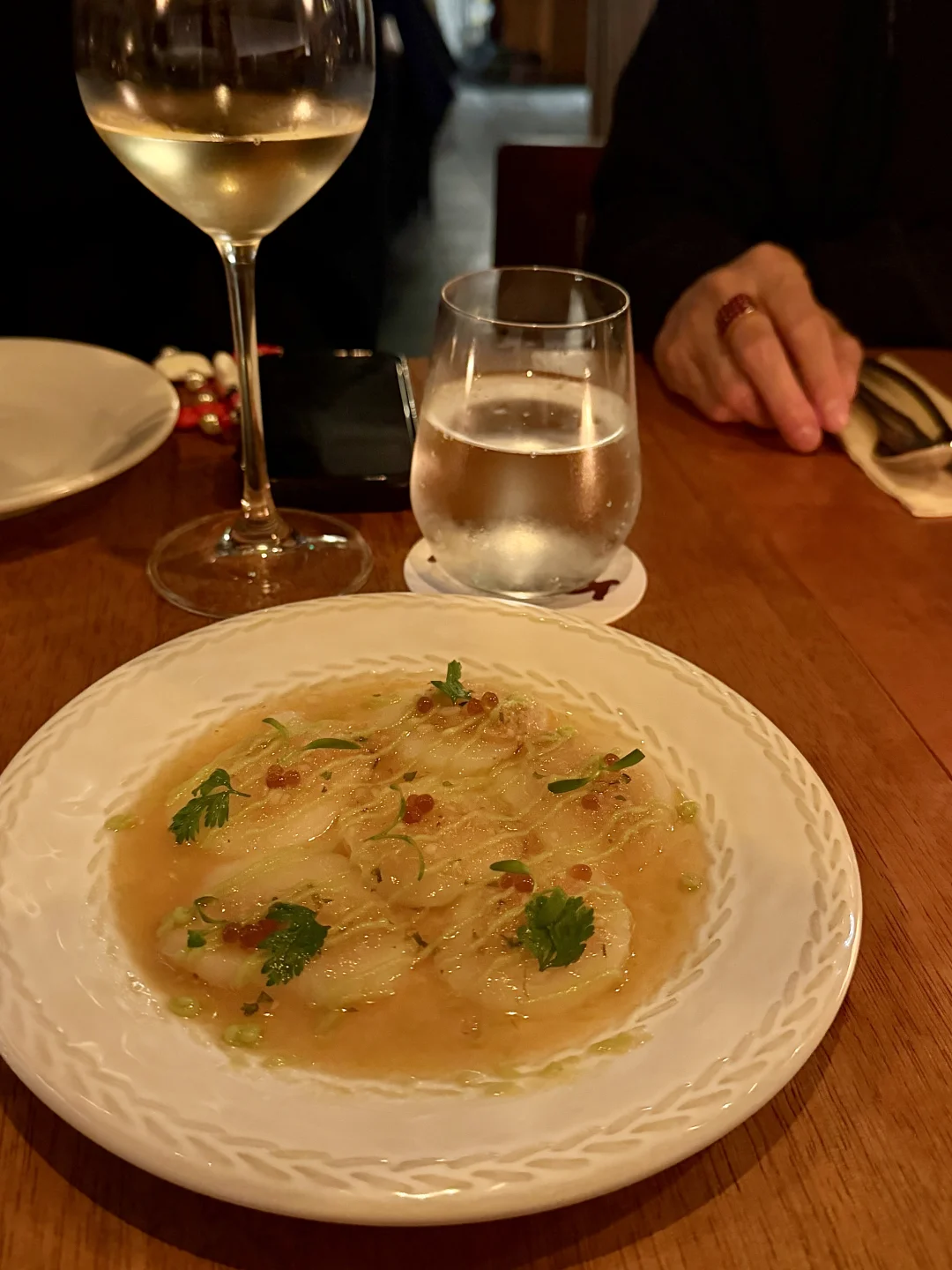 前菜推荐生腌扇贝、柑橘香菜三文鱼、
