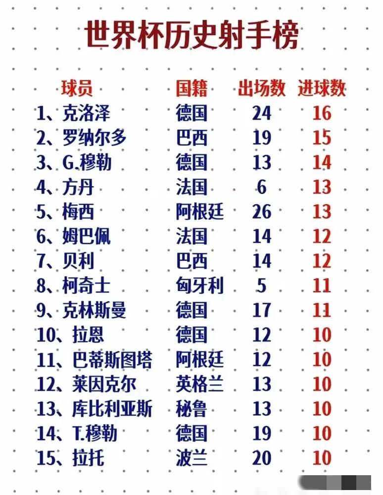 目前C罗参加了5届世界杯,总共打进了8球,在世界杯历史射手榜上排不上号,大概排名20名以外。进球最多的是德国球星克洛泽,目前以16球排名第一!目前能够对这个位置保持威胁的也就梅西和姆巴佩,梅西13球,姆巴佩12球,而且他俩都会在今年的美加墨世界杯出场,进球数还会变化,尤其是姆巴佩,年轻力壮,国家队强大,是本届世界杯最大夺冠热门,他的进球数大概率会飙升!
