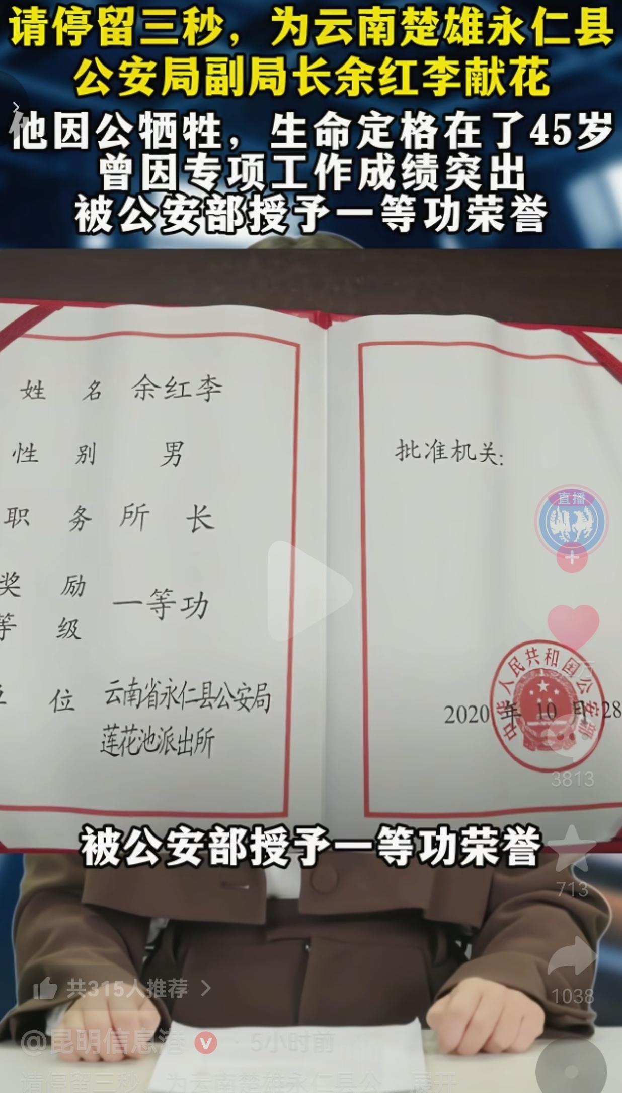 网友看到后评论说:看一次哭一次!余副局长用命换来了永仁的平安,我们永远不会忘记你!一路走好,英雄!