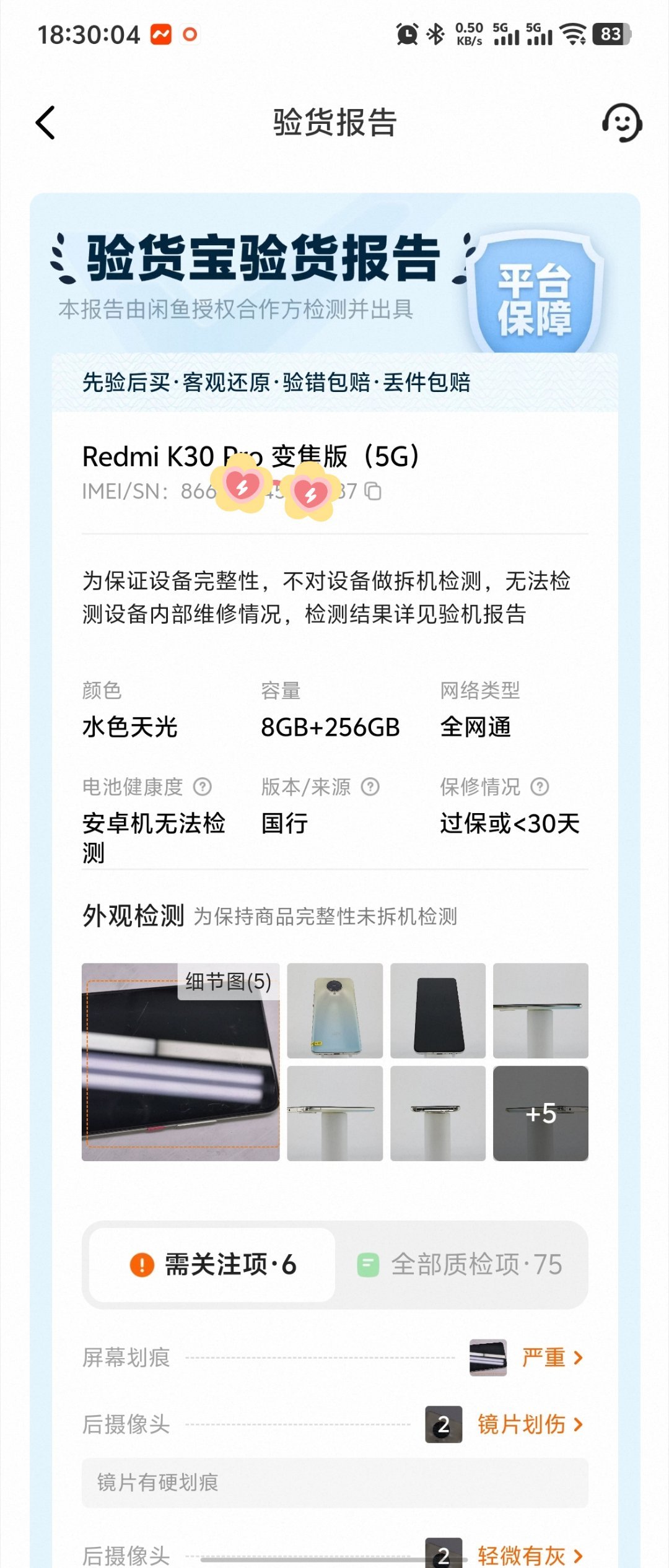 海鲜市场出了一个旧手机,第一次使用验货宝(买家自己要求的),检验的确实挺细致的,