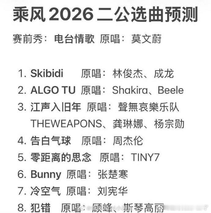 网传乘风2026二公选曲歌单二公选曲歌单来啦,多元化曲风,期待姐姐们的精彩表现乘风2026