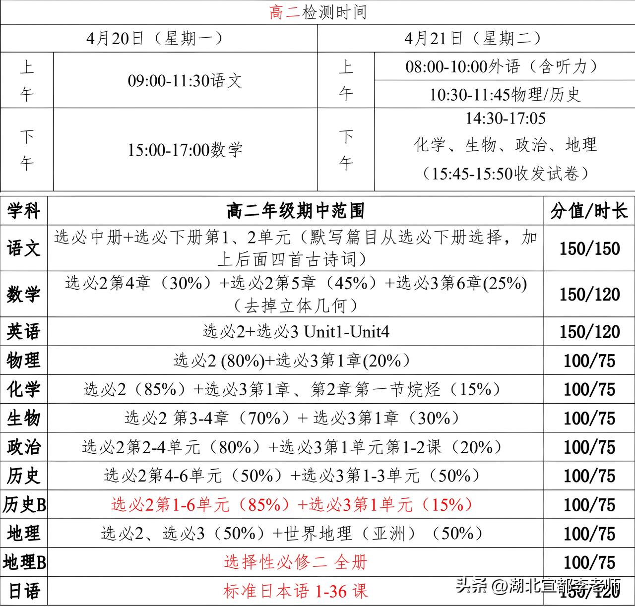 今天这篇头条,就是为高一、高二的家长,带来楚天协作体4月期中联考的命题范围以及考试时间。按照安排,高二期中4月20日4月21日举行;高一期中4月27日4月28日举行。