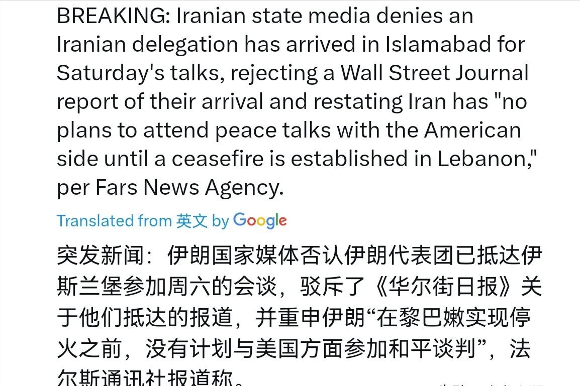 4月10日,根据伊朗法尔斯通讯社最新报道,伊朗官方媒体公开否认伊朗代表团已抵达伊斯兰堡参加周六的会谈,并严厉驳斥了《华尔街日报》此前有关伊朗代表团已经抵达的不实报道。
