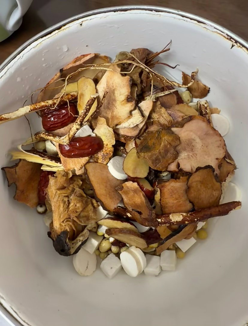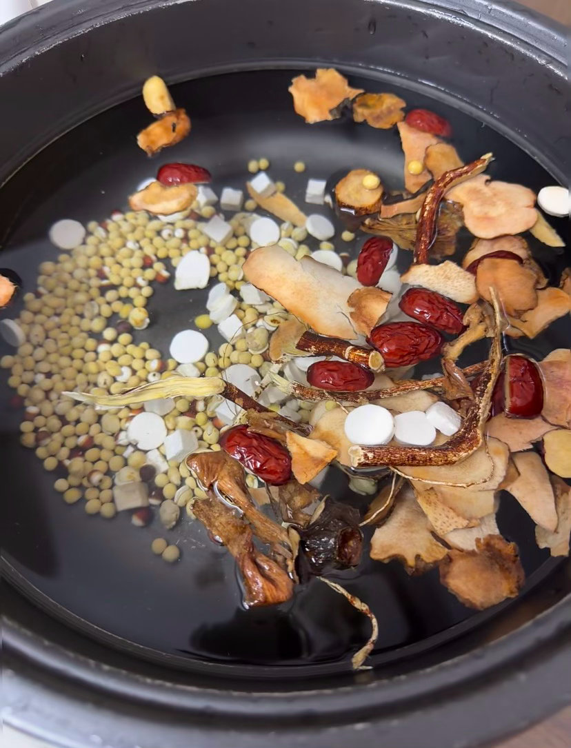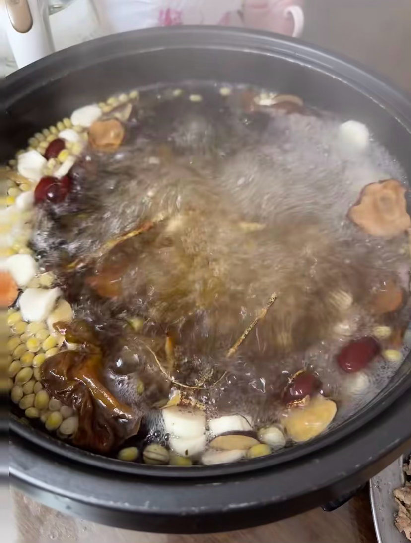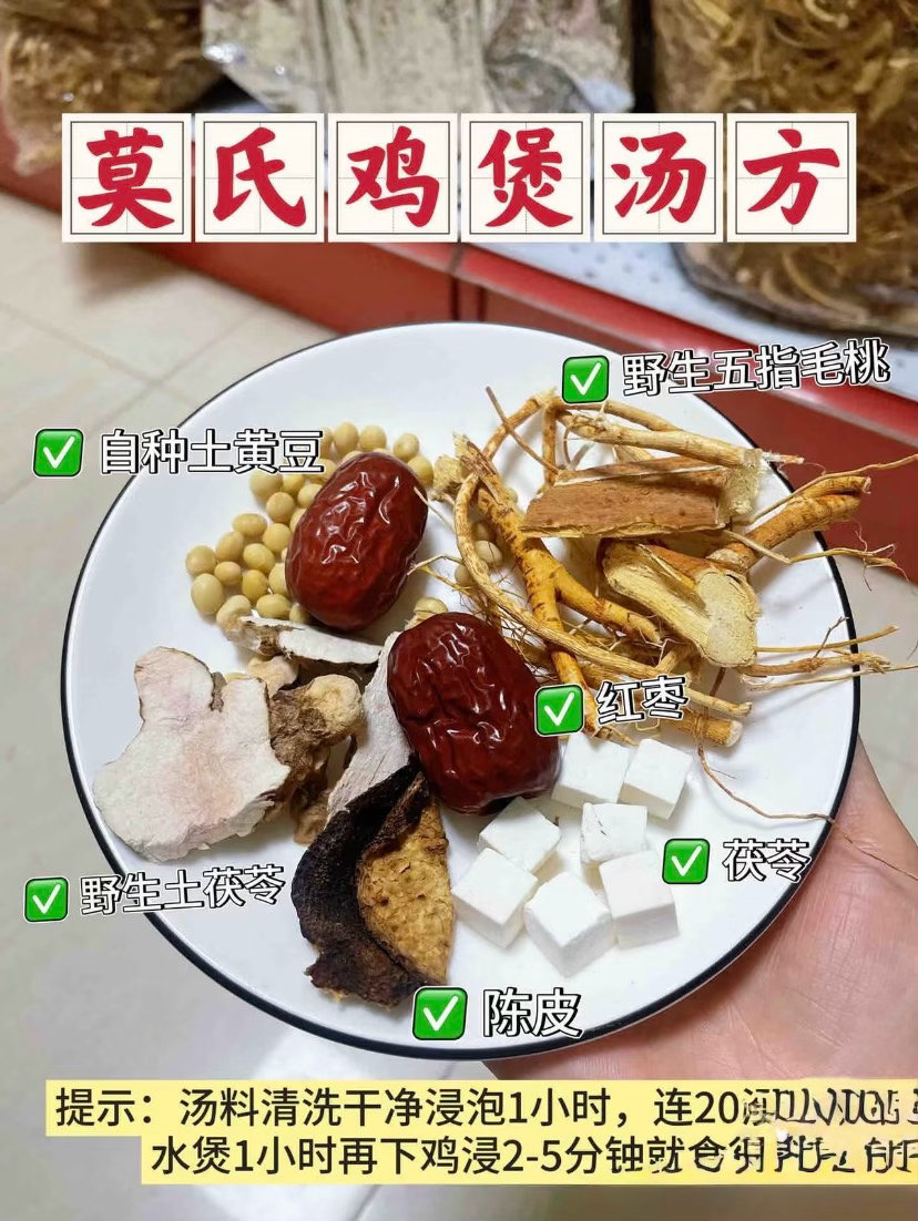 步骤非常简单:1️⃣药材可泡可不泡(如果你时间充足的话,可以提前泡30分钟,没有时间,药材洗净即可)2️⃣陈皮要刮一下陈皮内囊,这样不会苦3️⃣药材先煮,直接加水(锅多大就放多少水),冷水跟药材一起煮一个小时左右,五指毛桃和陈皮的香味会先闻到,喜欢五指毛桃的真的可以冲!4️⃣煮了一个小时药材之后,最后放鸡(鸡我们是没焯水的)直接生鸡放,煮10分钟左右即可,鸡很容易熟(嫩鸡就比较好嚼,老鸡就比较有嚼劲)5️⃣除了鸡,还可以放其他食材,比如海鲜🦞或者菇类,汤越煮越有味,盐不用放很多,一点点即可。