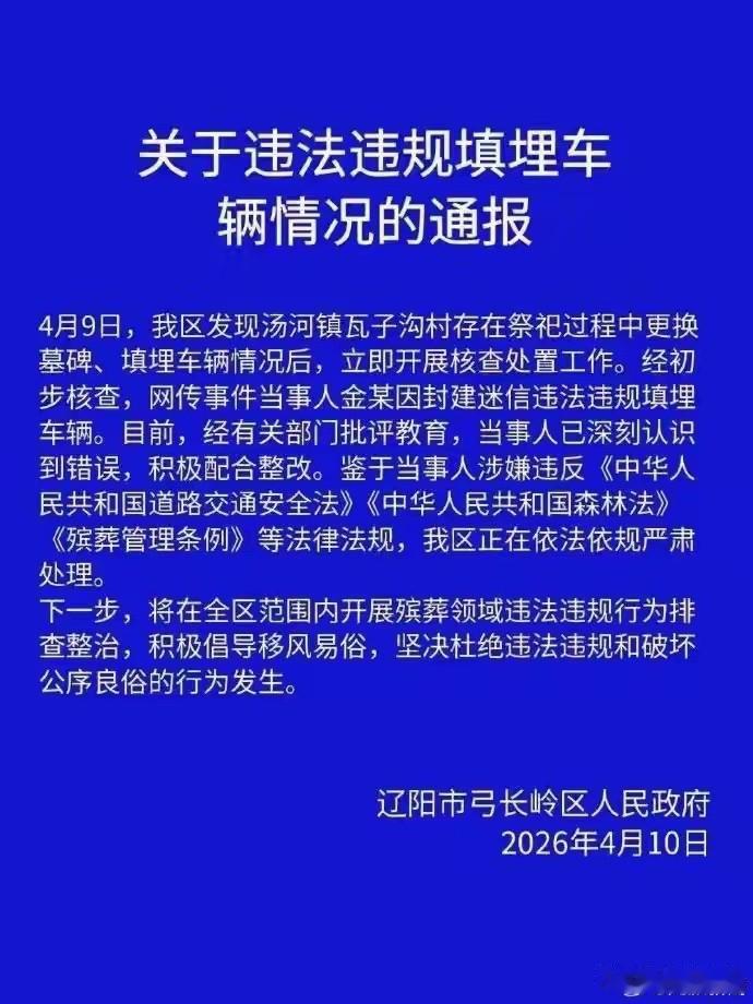 4 月 10 日,相关部门第一时间赶到现场核查处置,经过批评教育,当事人金某当天就认了错,赶紧组织设备把刚埋进去的奔驰车,又从土里完整挖了出来,完成了整改,后来还公开向公众道了歉。