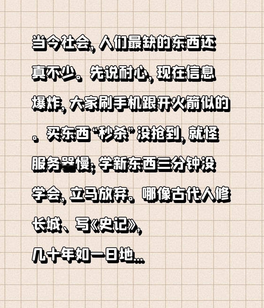 先说耐心,现在信息爆炸,大家刷手机跟开火箭似的。买东西“秒杀”没抢到,就怪服务器慢;学新东西三分钟没学会,立马放弃。哪像古代人修长城、写《史记》,几十年如一日地付出。现在大家都追求快和立竿见影,“快餐文化”让专注力和深度思考都没了立足之地。