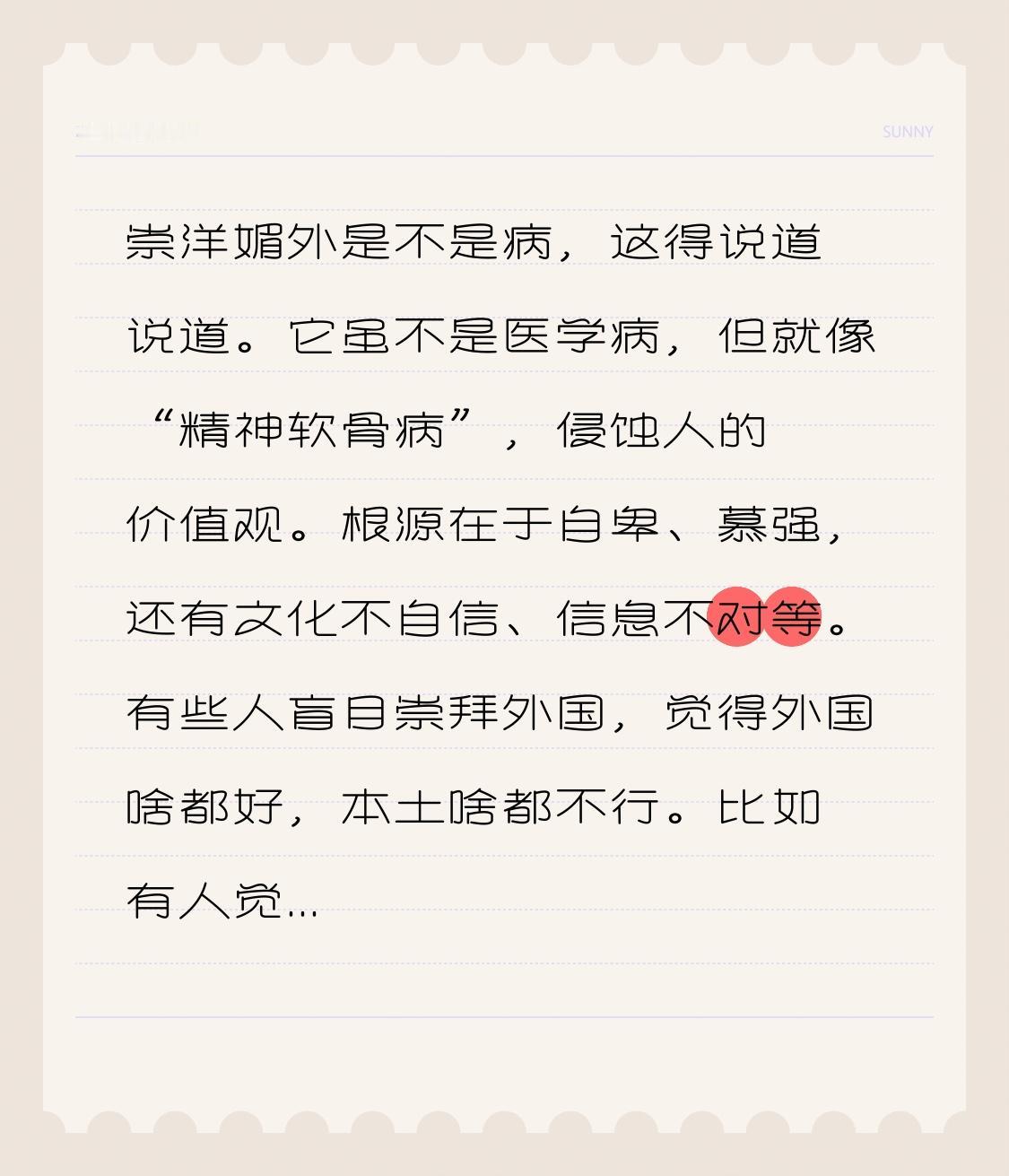 崇洋媚外是不是病,这得说道说道。它虽不是医学病,但就像“精神软骨病”,侵蚀人的价值观。根源在于自卑、慕强,还有文化不自信、信息不对等。