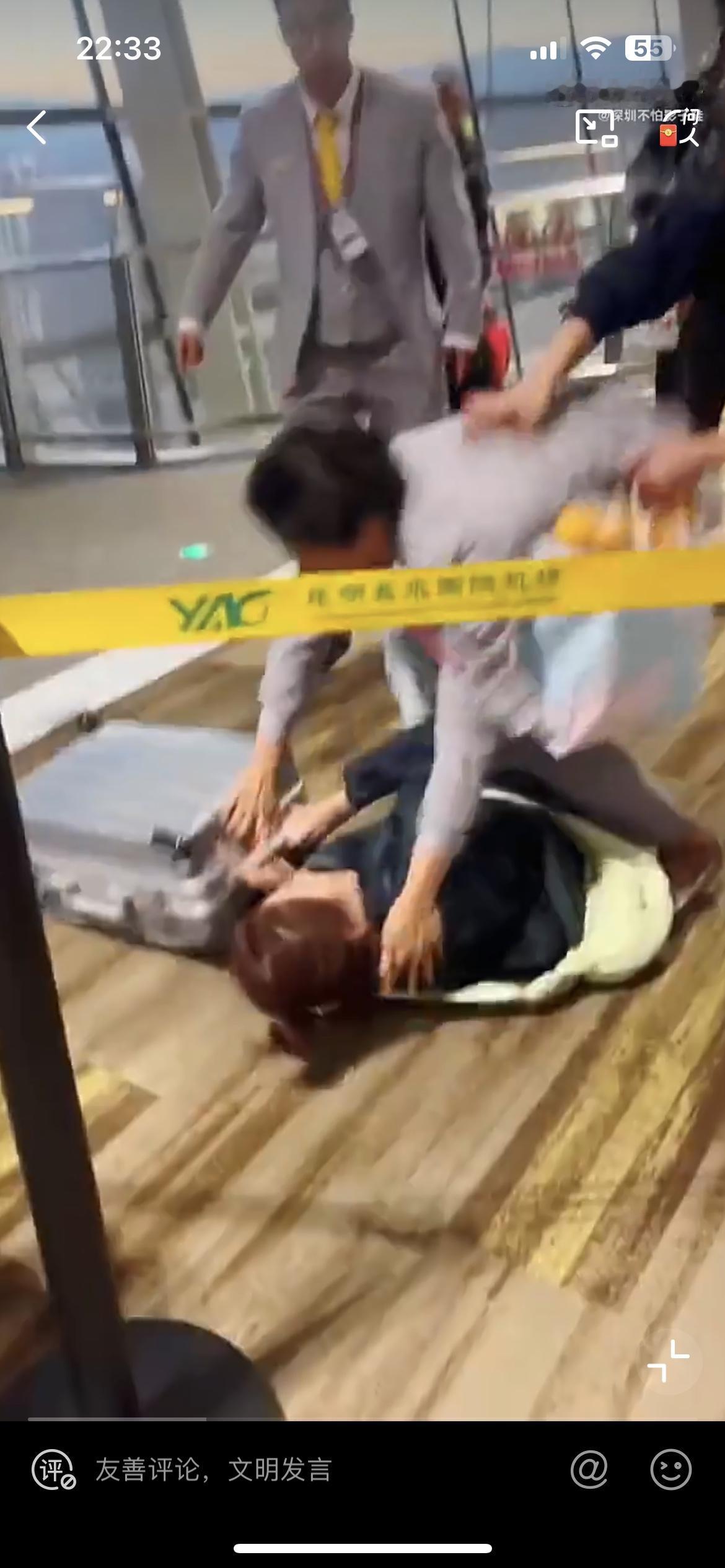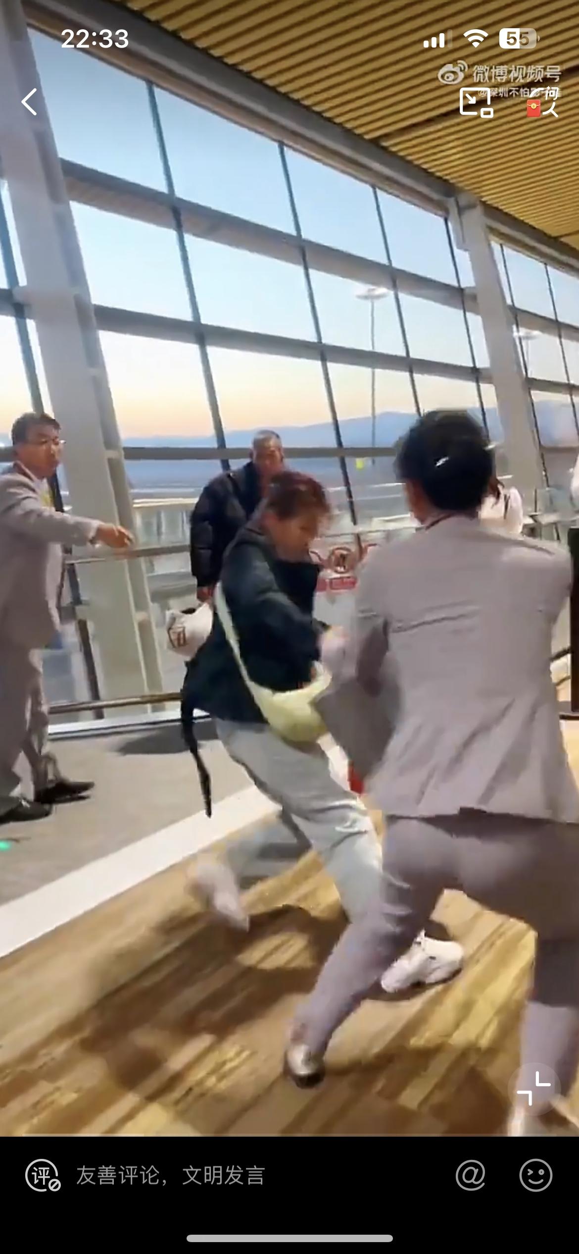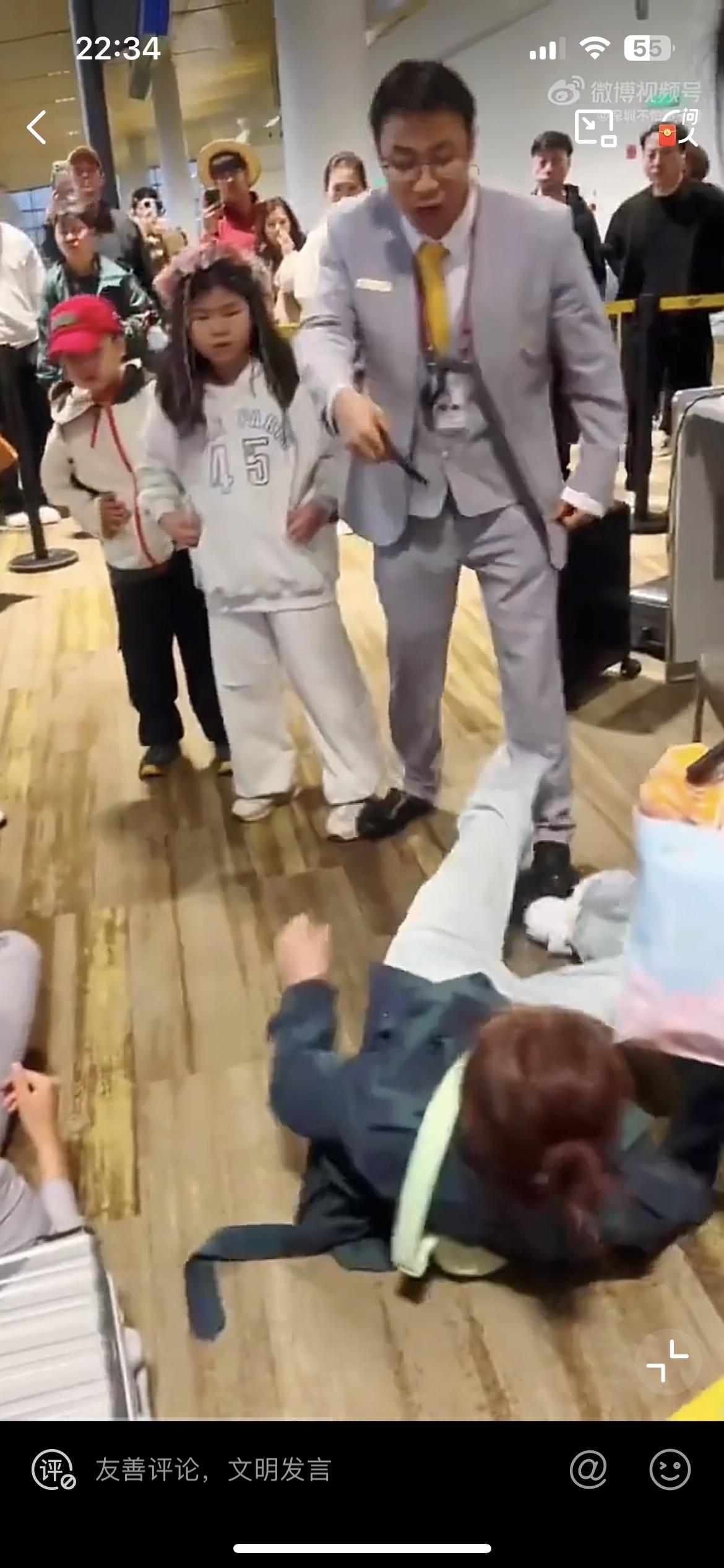 一名女工作人员拉住老太的箱子,两人摔倒在地。老太的女儿趁机踢向女工作人员,被男工作人员拦下后,又踢了男工作人员一脚。