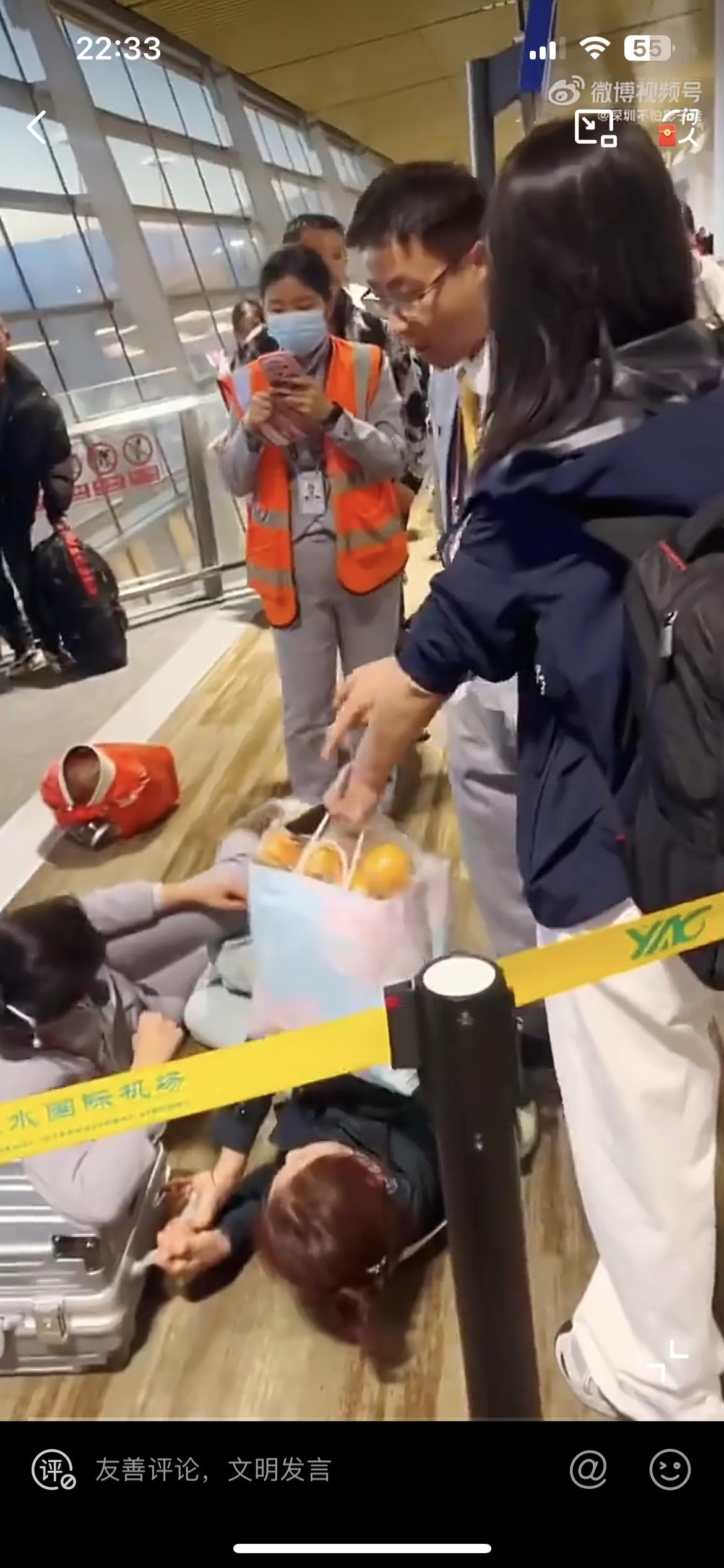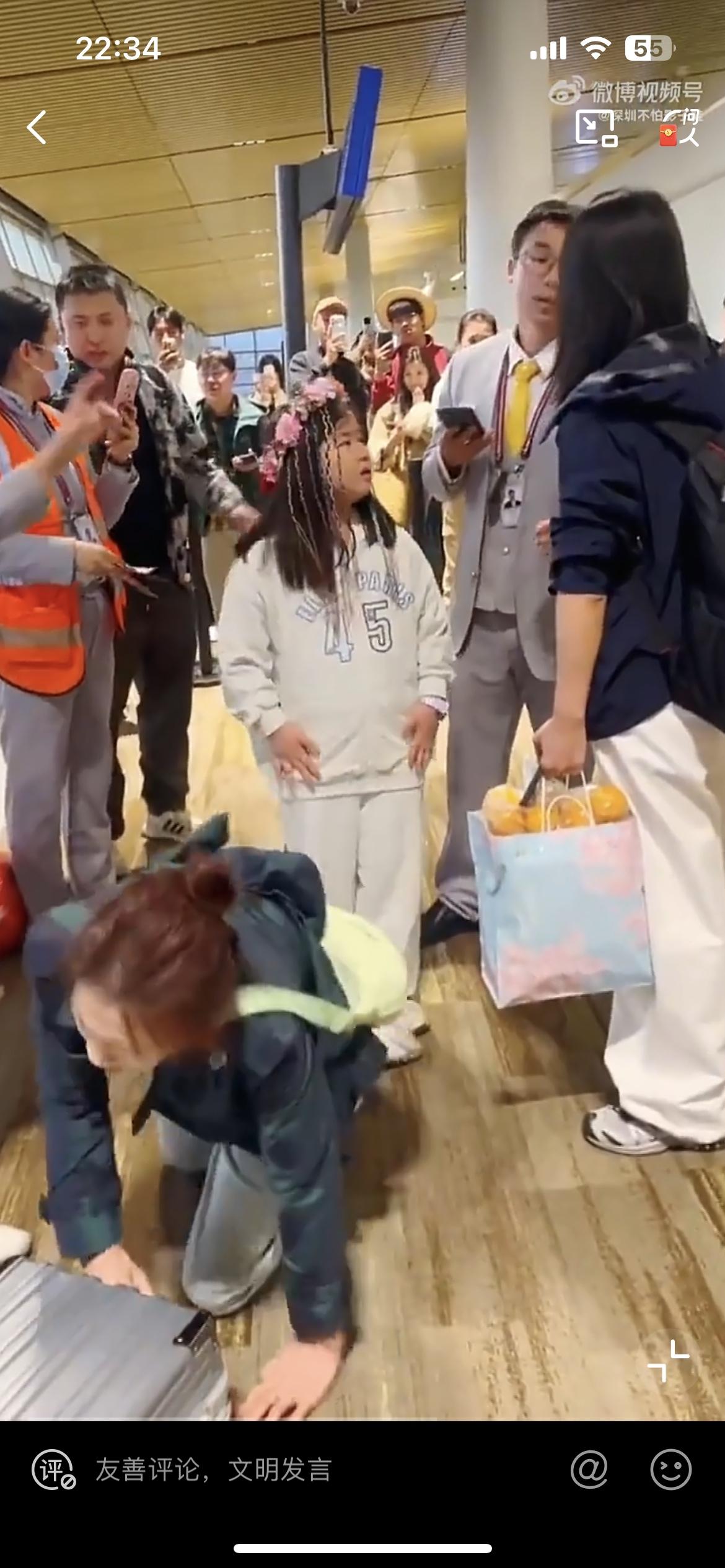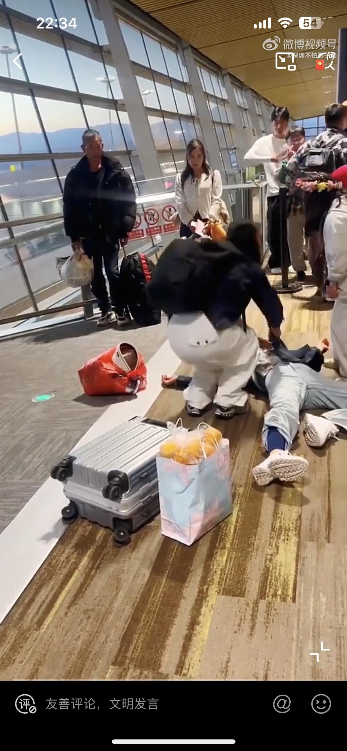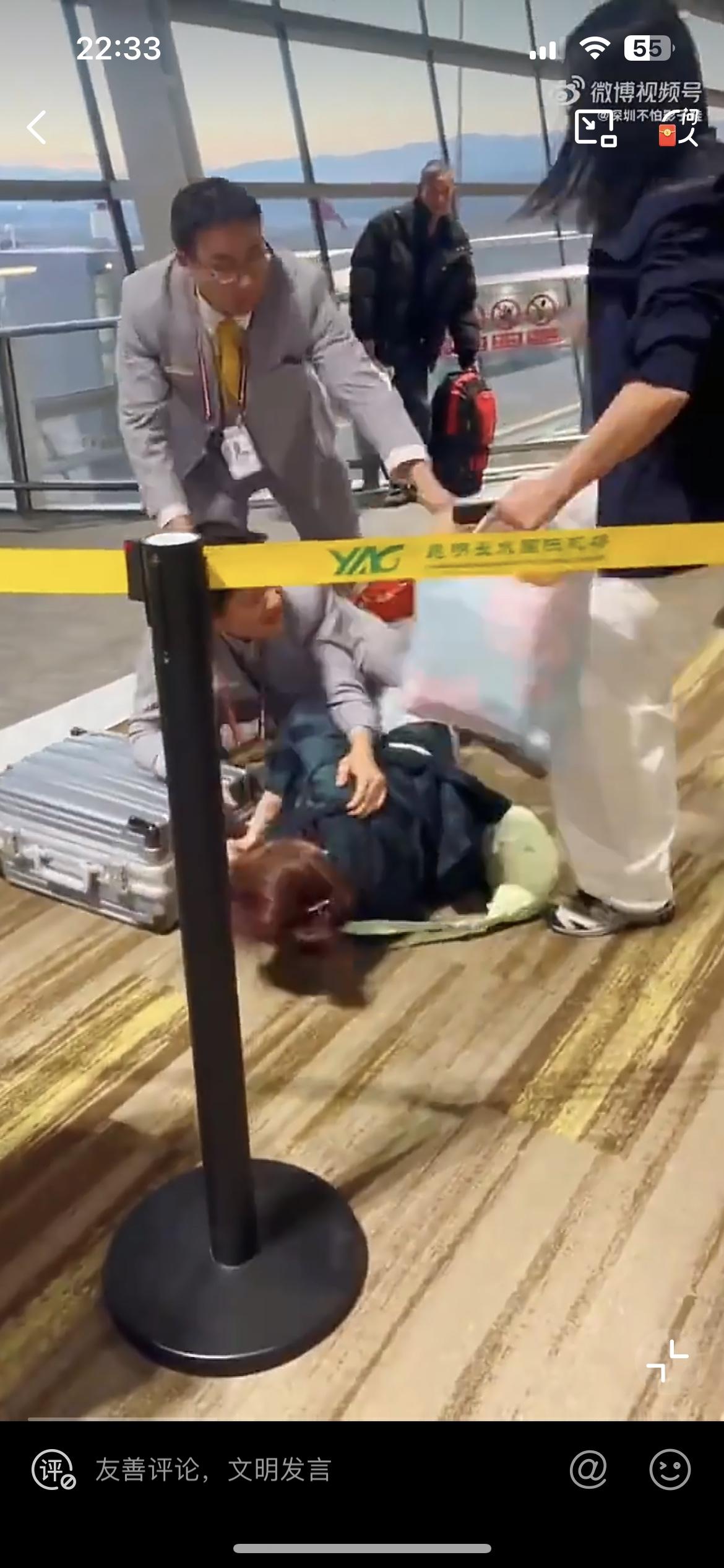 一名女工作人员拉住老太的箱子,两人摔倒在地。老太的女儿趁机踢向女工作人员,被男工作人员拦下后,又踢了男工作人员一脚。